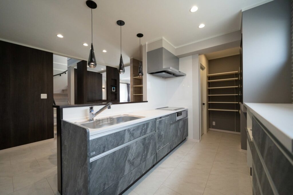 キッチンと玄関を直線で結ぶ2WAYのアクセス動線により、買い物から帰ってすぐにパントリーへ収納できる便利な間取り。