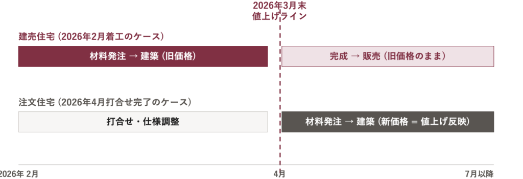 - 注文住宅の場合:打合せ完了後に、その時点の価格で材料を発注する流れとなるため、最新の建材値上げの影響をダイレクトに受けやすい傾向にあります。