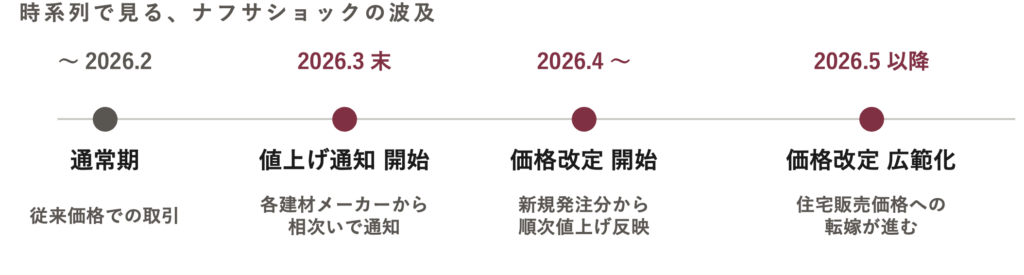 これにより、樹脂・断熱材・配管といった多くの建材メーカーにおいて、2026年3月末から価格改定の動きが見られ始めました。