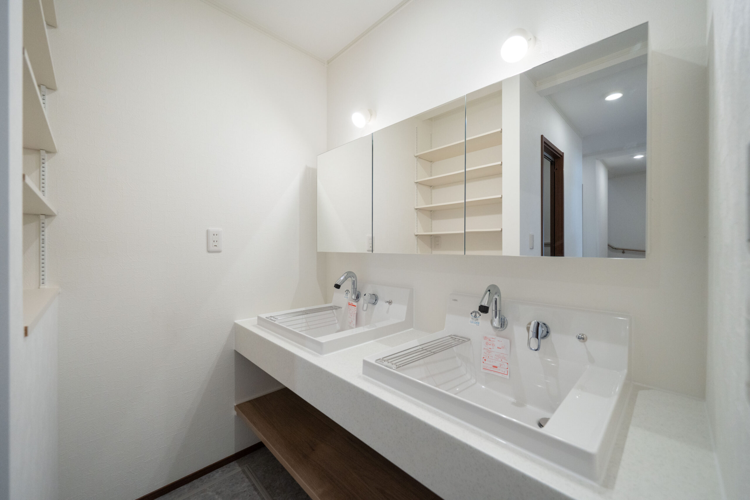 忙しい朝でも快適に使えるよう、横並びで設置された2ボウルの洗面台。並んで支度ができるので「順番待ち」がなく、家族全員が気持ちよく一日をスタートできます。