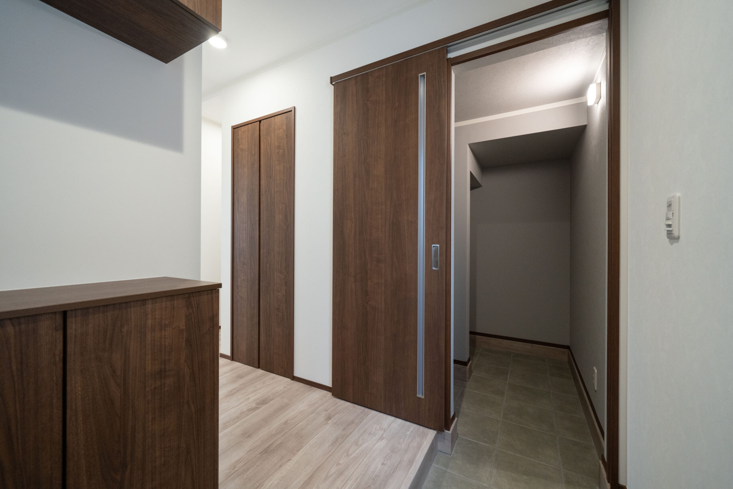 玄関を入ると、広々とした土間収納がお出迎えしてくれます。靴はもちろん、ベビーカーやアウトドア用品、季節の家電までたっぷり収納できます。