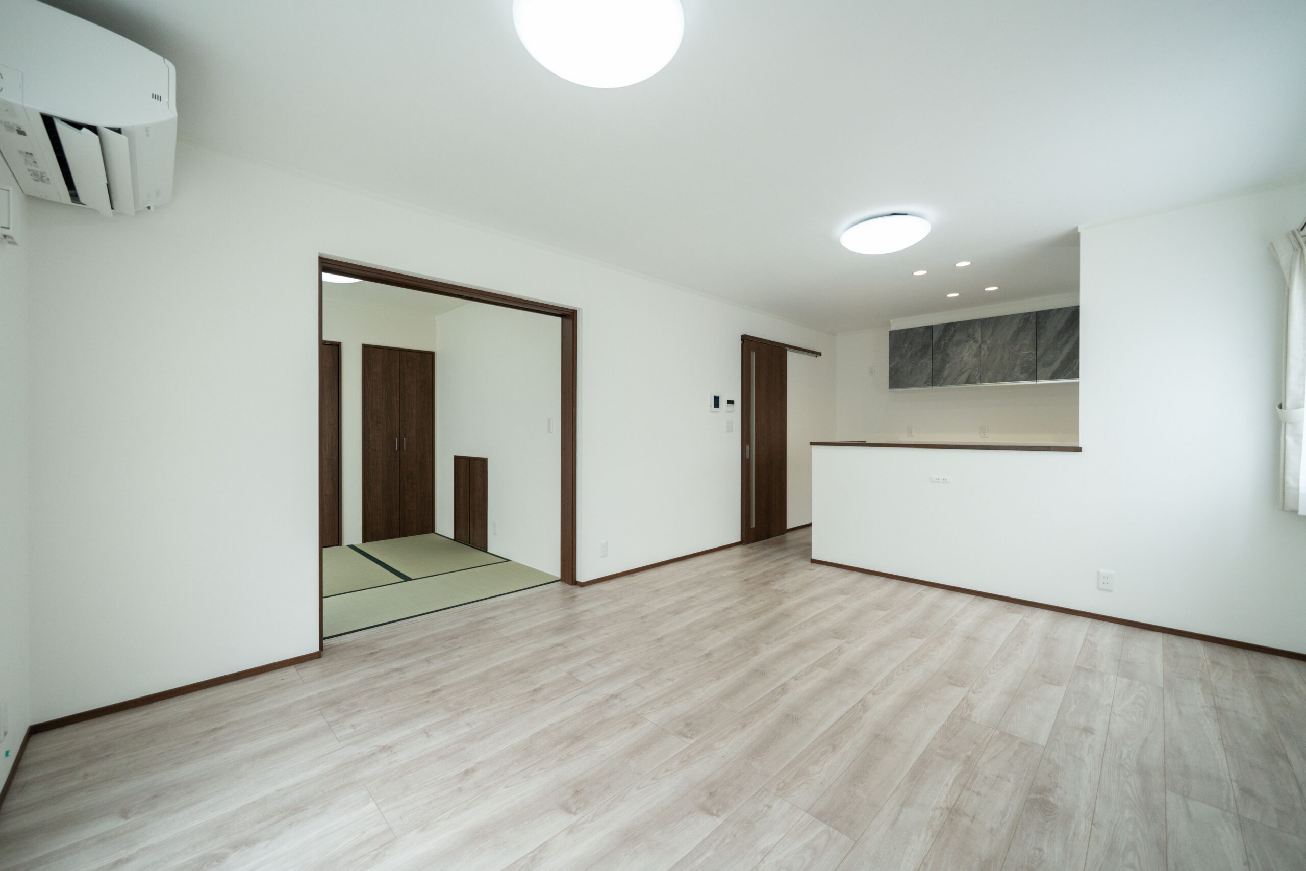 シンプルモダンな雰囲気でまとめられたLDKは、直線上にリビング・ダイニング・キッチンが並ぶ開放的な空間。