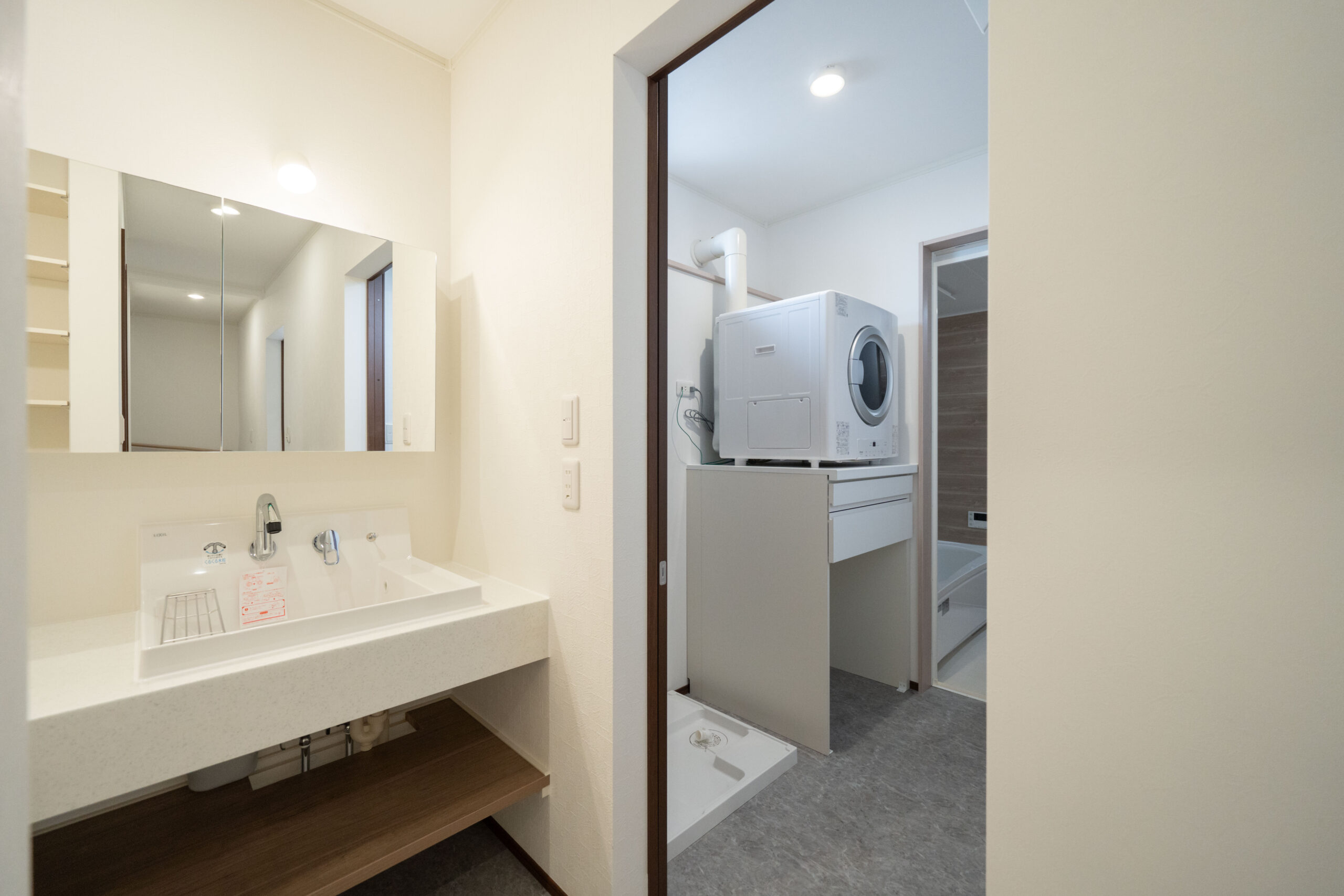 また、洗面スペースと脱衣室を分けているため、誰かが入浴中でも洗面が使えて便利。脱衣室にはガス衣類乾燥機「乾太くん」を完備しており、洗濯から乾燥、収納までが最短動線で完結。家事効率がぐっと上がり、毎日の暮らしにゆとりをもたらします。