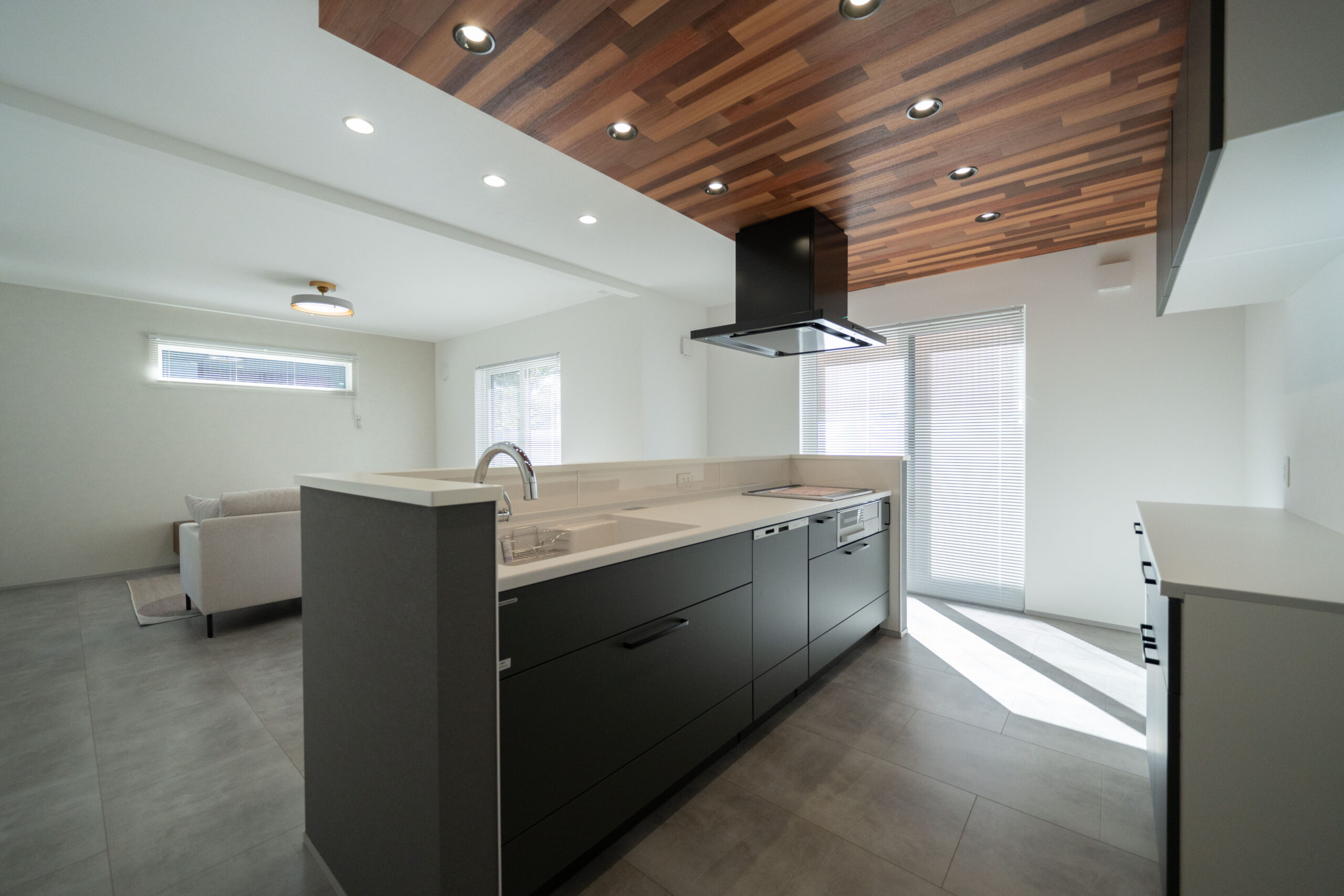アイランド風に配置したキッチンは、どこに立っても家族の気配を感じられるオープンな設計。木目の下がり天井がリビングとのつながりを生み、デザイン性と温かみを両立しています。