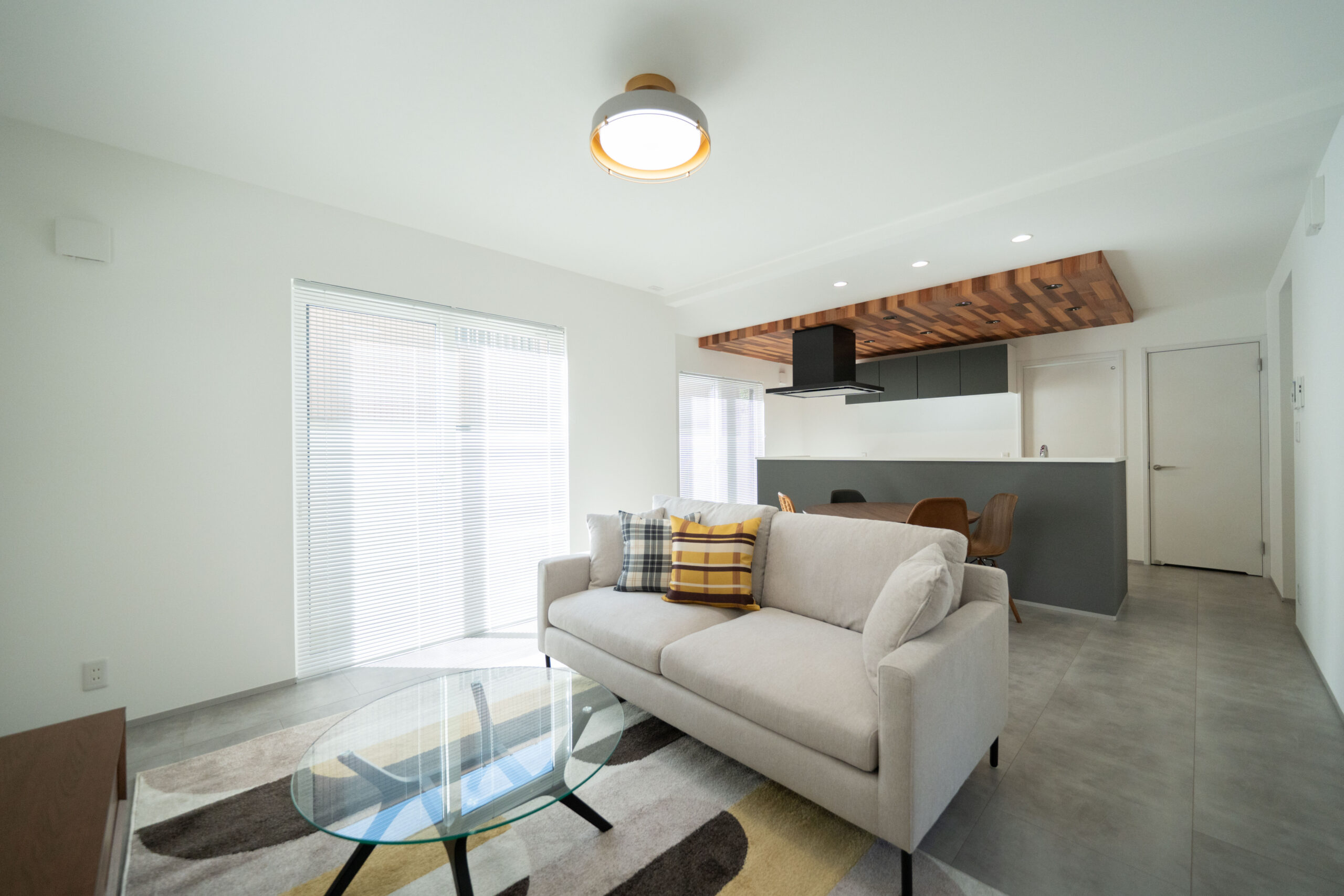 新登場のミッドセンチュリースタイルの家は、グレーを基調に木目天井が映える上質なLDKと、