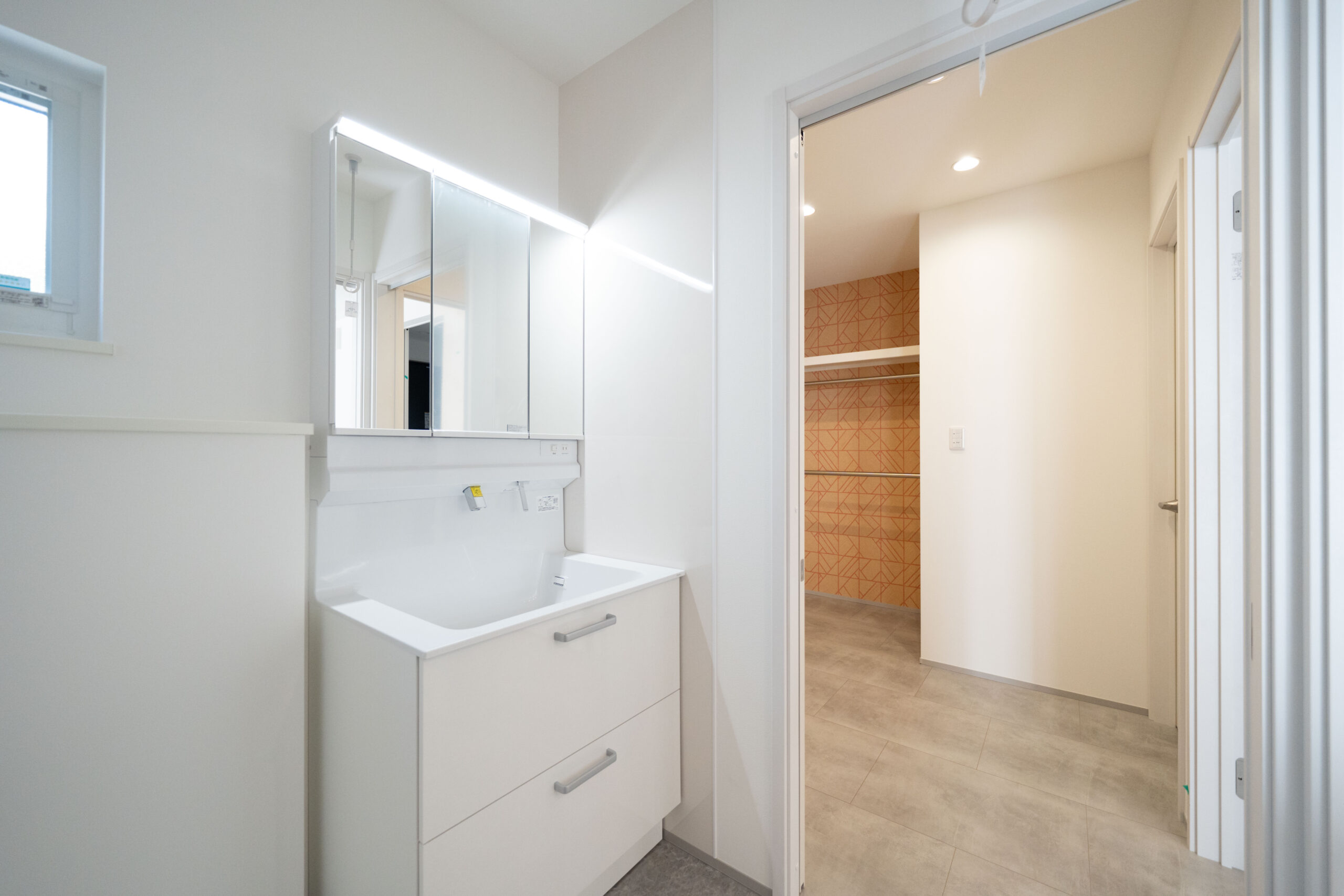 2人並んで使ってもゆとりがあり、朝の準備も混み合わず快適。脱衣室と空間を分けることで、来客時にも気兼ねなく使えるのも嬉しいポイントです。