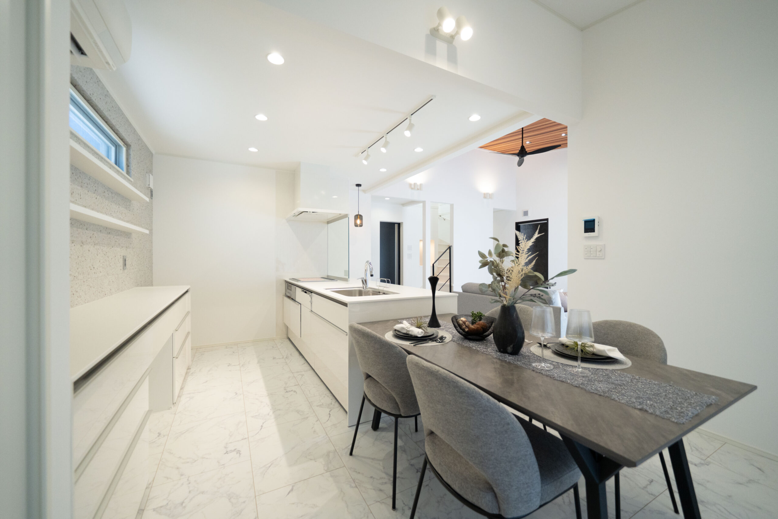 真っ白なキッチンは、空間全体を明るく広く見せる効果があり、ホテルのような清潔感を演出。ダイニングと横並びに配置することで、食事の配膳や片付けもスムーズに行えます。