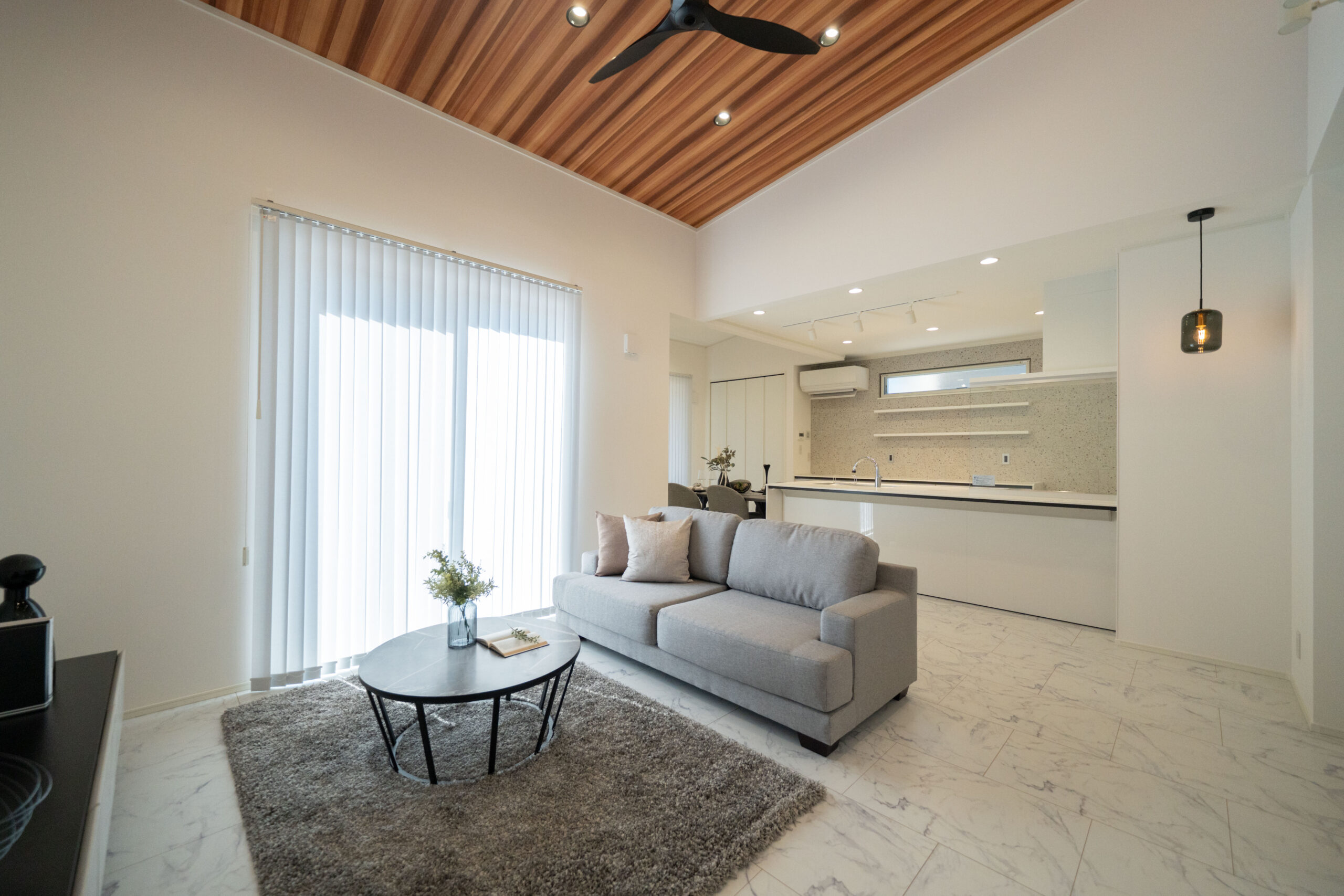 バーチカルブラインドが生み出す陰影が、上品なホテルライク感をさらに引き立てます。くつろぎとデザインが共存したリビングは、家族が自然と集まる心地よい場所です。