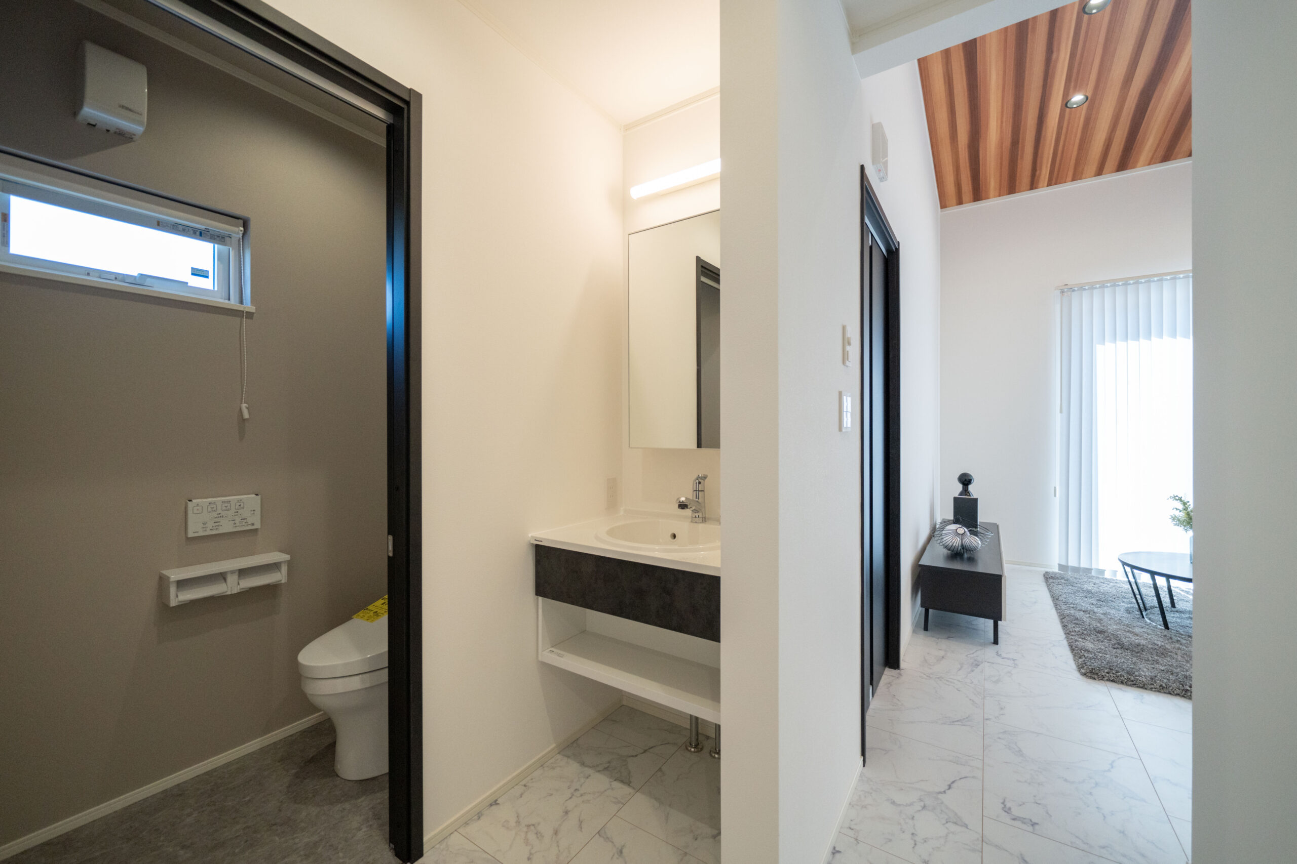脱衣室と分けたことで、家族の入浴中でも気兼ねなく使える便利な設計。手洗いや身支度がしやすく、生活動線の中で自然に活躍します。