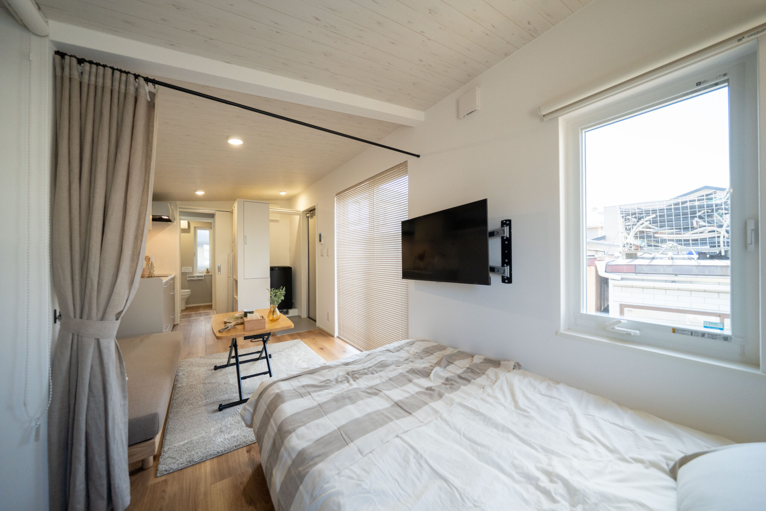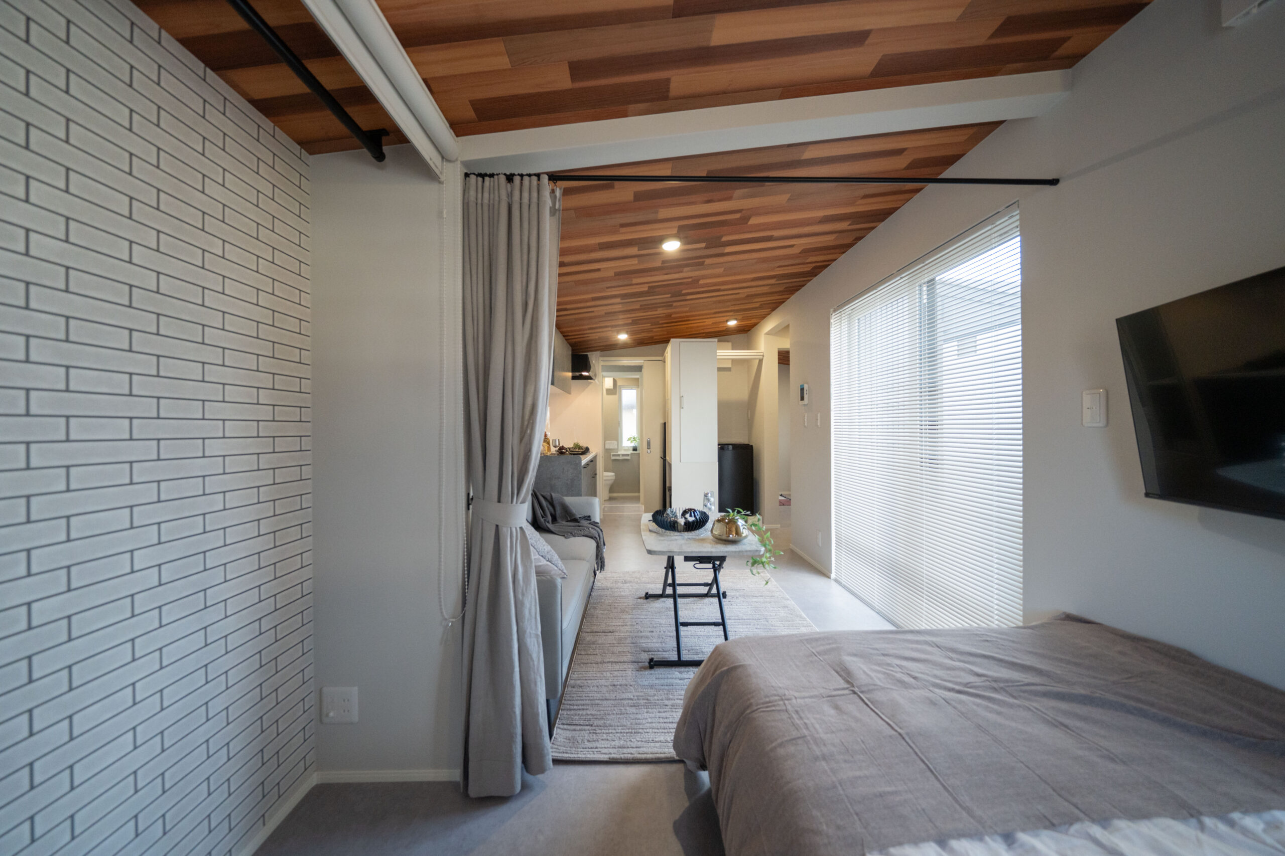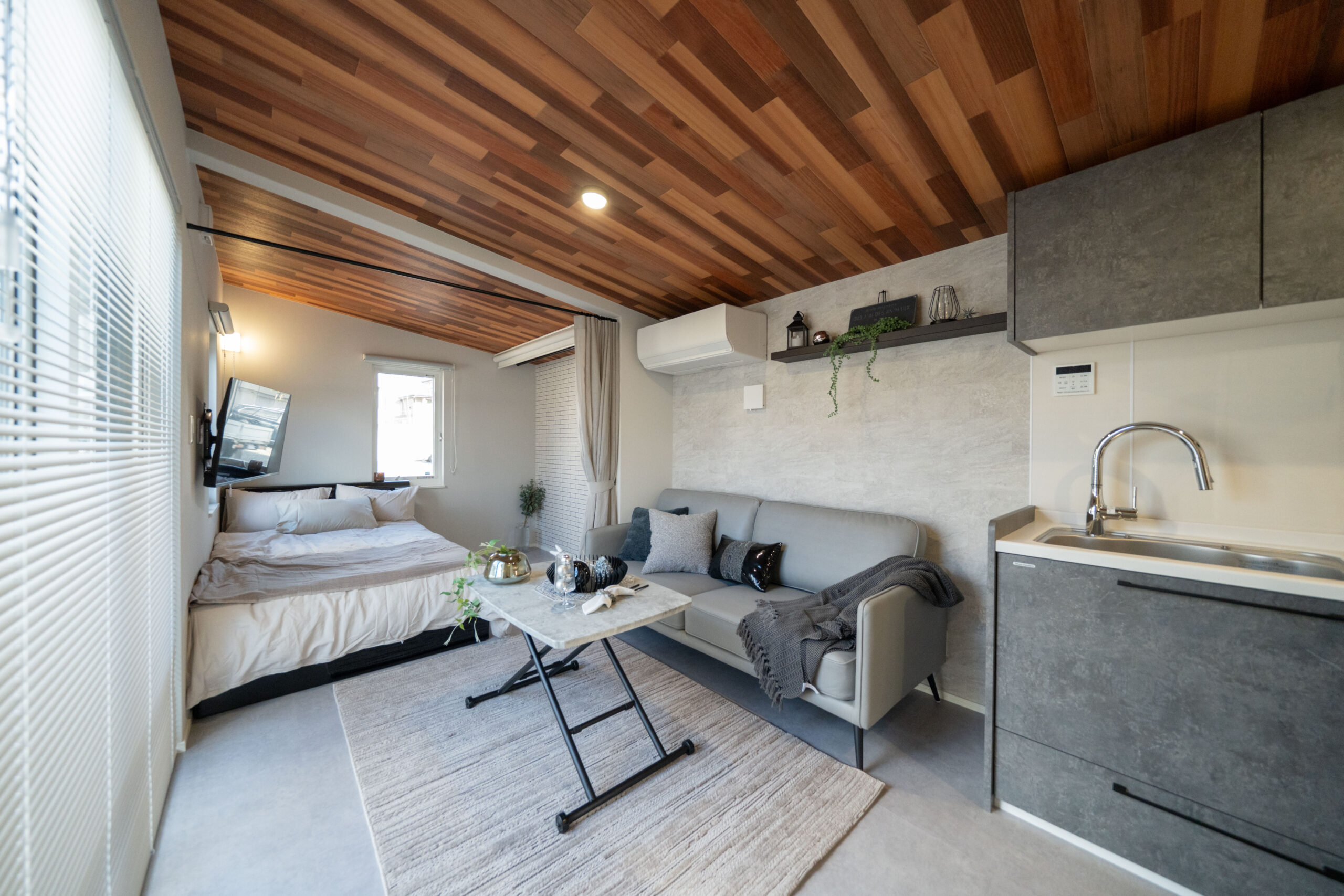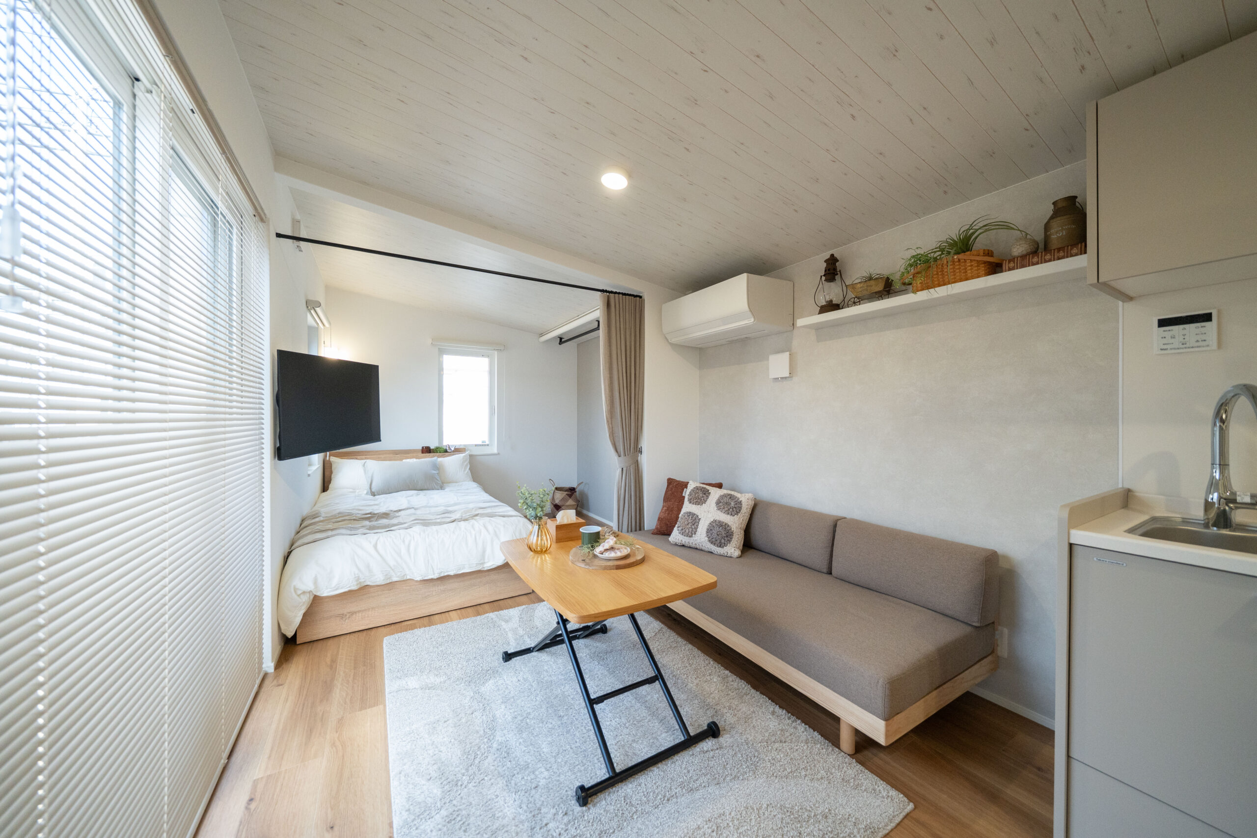 約5.5坪というコンパクトなサイズながら、リビング・キッチン・ベッドスペースを一直線に配置したワンルーム空間。視線が奥まで抜けるレイアウトにすることで、実際の面積以上の広がりを感じられる設計です。ナチュラルな色合いでまとめた内装は、木のやさしさを感じられ、長く過ごしても疲れにくい雰囲気に仕上がっています。