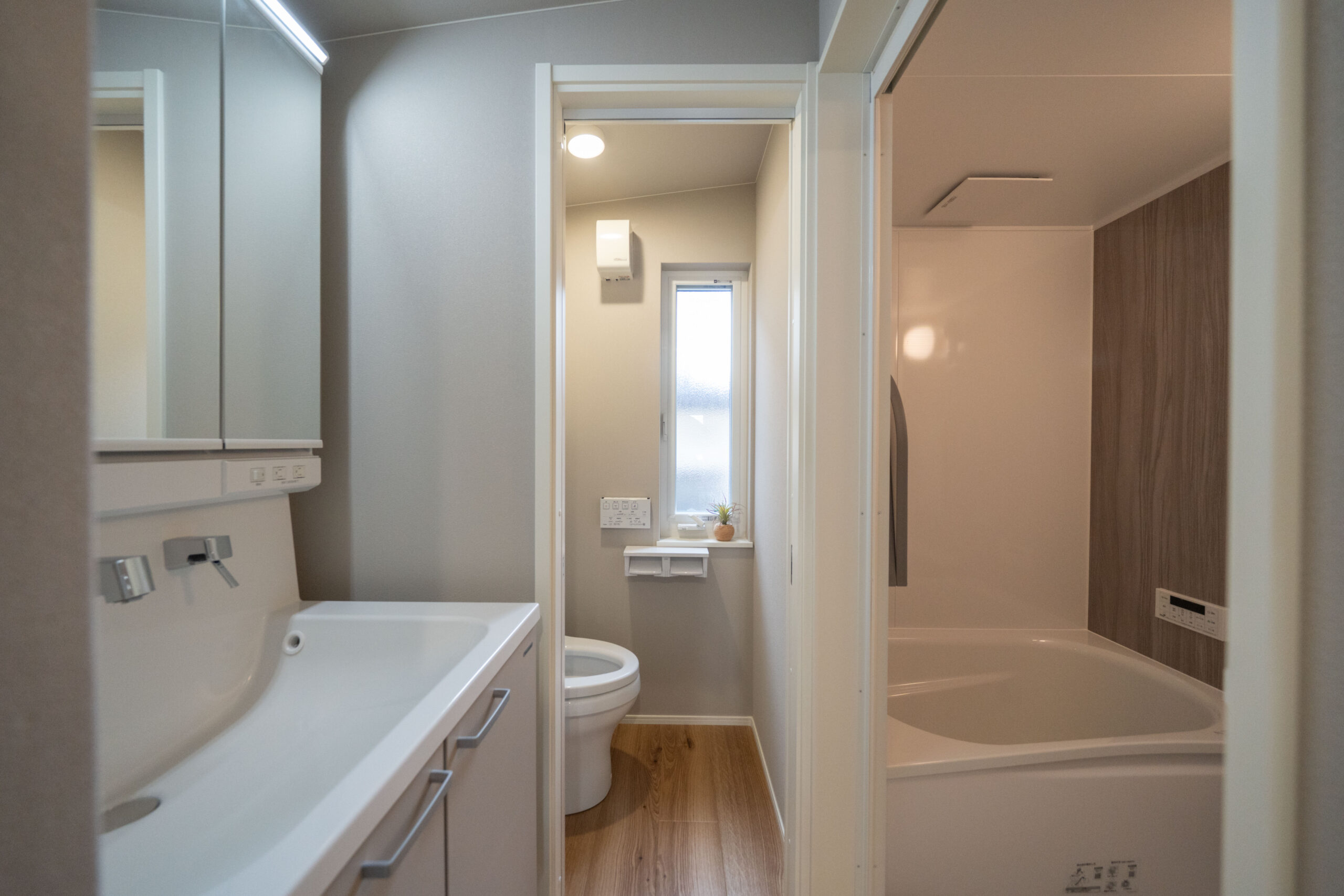 キッチンの奥には、洗面スペース・トイレ・浴室をまとめた水まわりゾーンを配置。動線を短くすることで、移動のムダを省き、日々の暮らしをスムーズにしています。浴室はコンパクトながらも、しっかりと浴槽を備えたユニットバスを採用。「シャワーだけでいい」ではなく、ちゃんと湯船に浸かれる快適さを大切にしました。