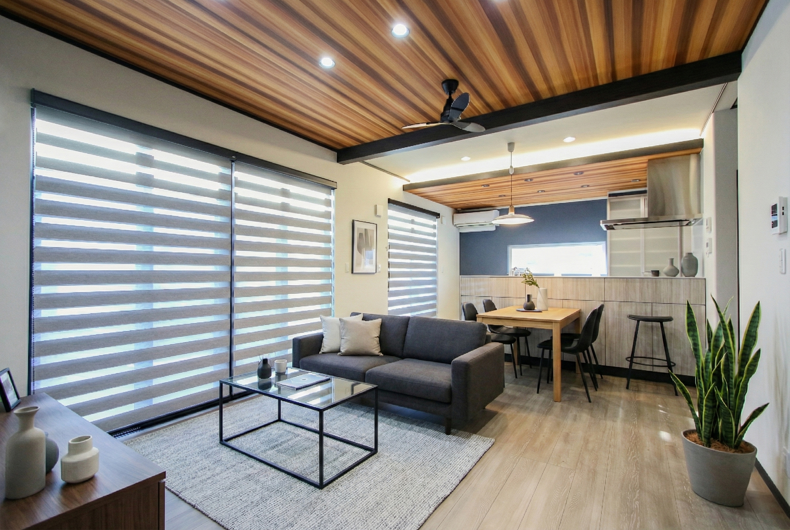 LDKはグレージュを中心とした色合いに、木目調の天井と、黒の飾り梁がアクセントに。壁掛けテレビを設置出来るように施工し、壁にはエコカラットを貼ることで立体感を演出してくれます。