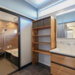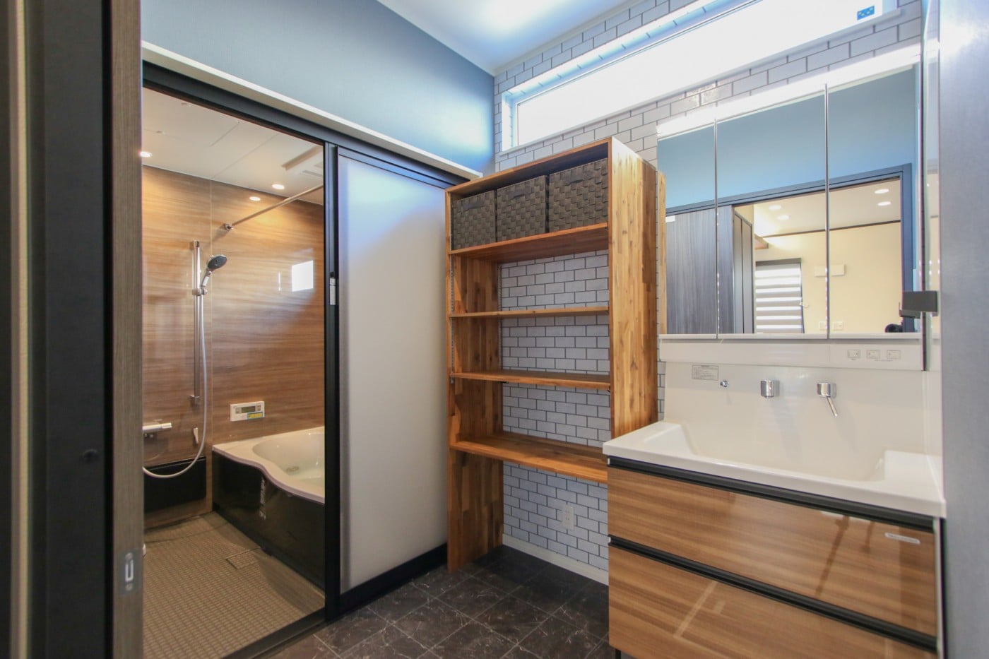 大理石調の床に、タイル調のクロスを採用した洗面脱衣室には造作の棚を設置しました。タオル類や着替えなど、ストレスなく収納することが出来ます。