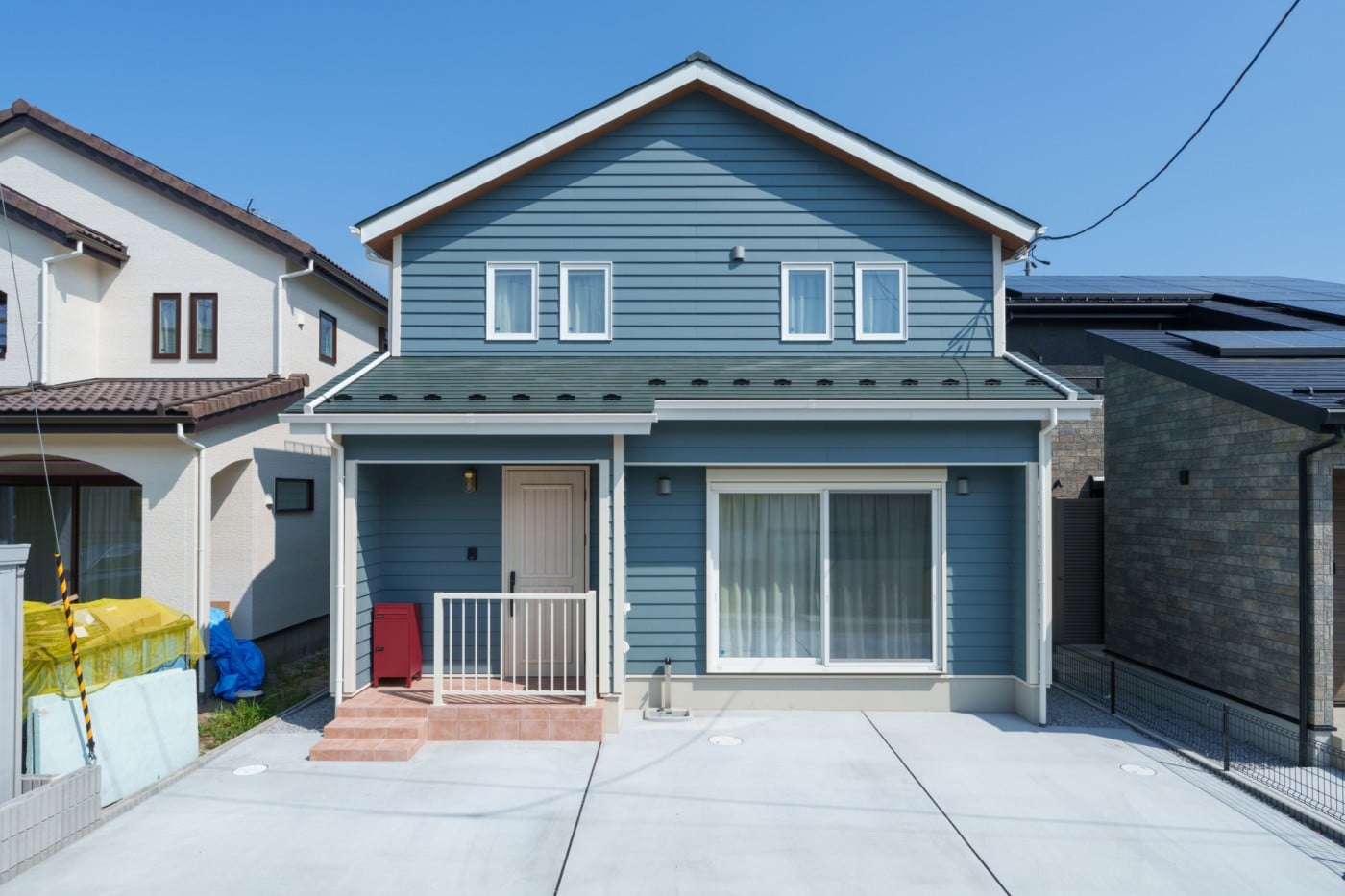 外壁はブラックに統一された重厚感のある仕上がりに。アクセントとして、軒天には木目を採用しました。屋根は南に片流れで、太陽光パネルを搭載しています。
