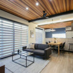 LDKはグレージュを中心とした色合いに、木目調の天井と、黒の飾り梁がアクセントに。壁掛けテレビを設置出来るように施工し、壁にはエコカラットを貼ることで立体感を演出してくれます。