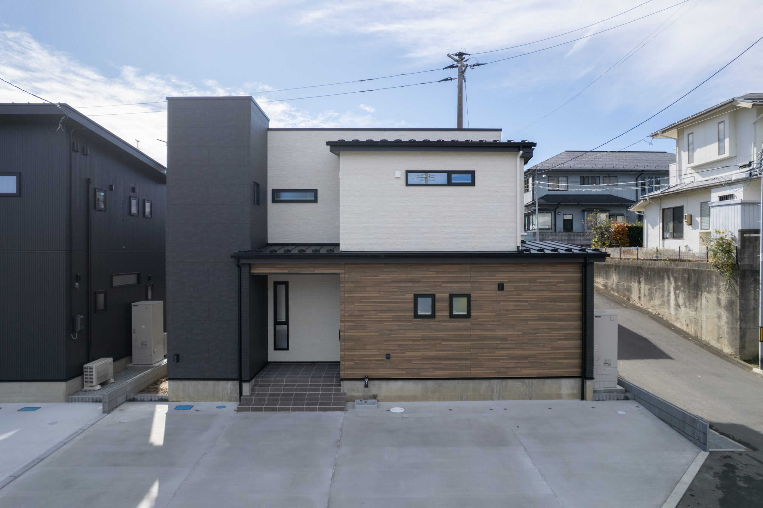 外壁にはニチハの「イルミオ」シリーズを採用。木目の袖壁がアクセントで、スタイリッシュでモダンなデザインに仕上がりました。