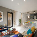 明るく開放感のある16帖のLDK。ミッドセンチュリーの家具が映えるよう、内観の色味はシンプルにまとめました。カーテンもブラインドを採用し、スッキリとした印象に。コーナーのペンダントライトもおしゃれを演出しています。