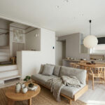 直線的に配置されたLDKは、視界が抜けて広々とした印象を与える空間。木目とグレーを組み合わせた落ち着きのあるジャパンディテイストが、シンプルながらも上質な雰囲気を演出します。LDKが一体となったレイアウトは、どこにいても家族の存在を感じられる距離感が魅力。自然と会話が生まれる、心地よい暮らしを叶えてくれるリビングです。