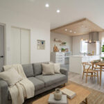 木のぬくもりと優しい色合いが調和したナチュラルなLDK。テレビ背面のエコカラットが空間に上質さをプラスし、すっきりとした印象を演出しています。壁掛け施工により床まわりを広く使えるため、開放感もたっぷり。家族が自然と集まる心地よいリビングです。