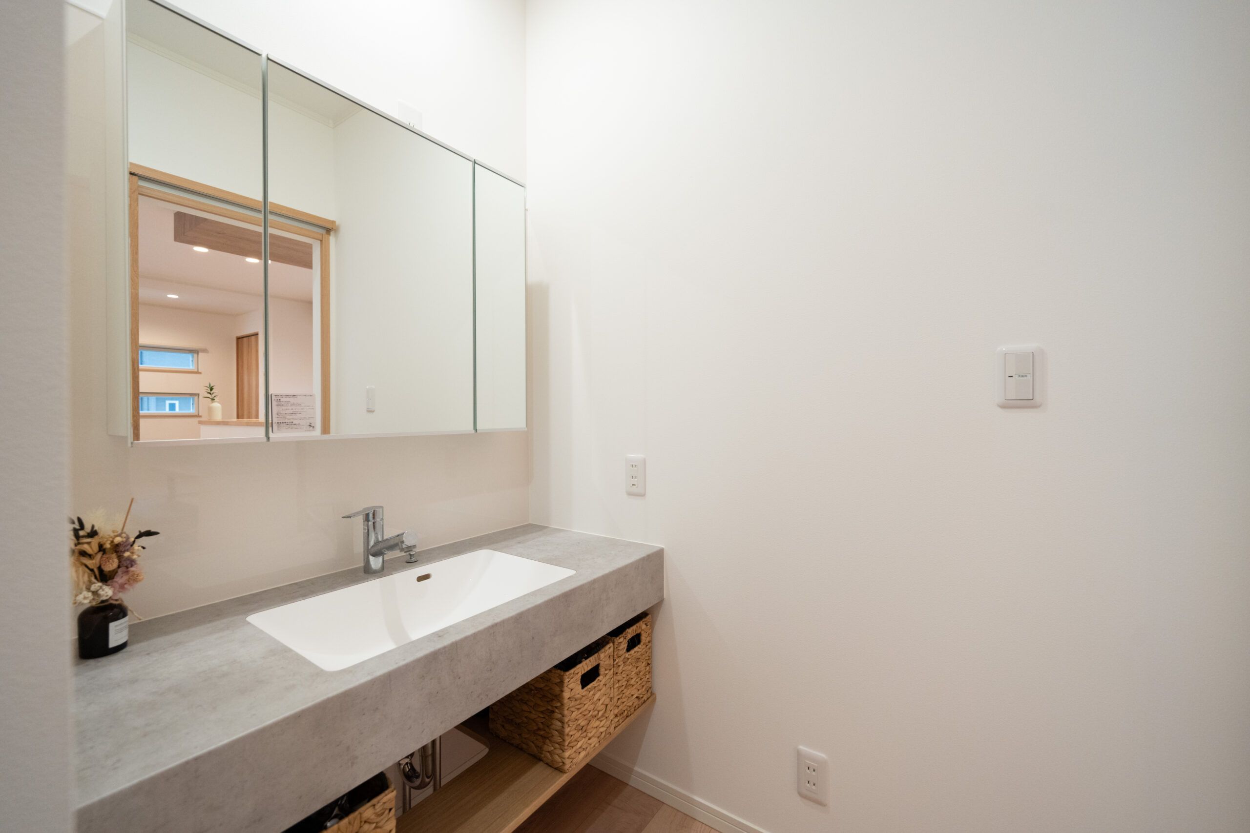 空間にすっとなじむ、シンプルながら高級感のあるアイカ工業の造作風洗面台を採用。木製の棚と籠収納がアクセントとなり、見せる収納と隠す収納をうまく使い分けられます。脱衣室の外に配置されているため、家族の入浴中でも気兼ねなく洗面が使えるのも嬉しいポイント。