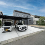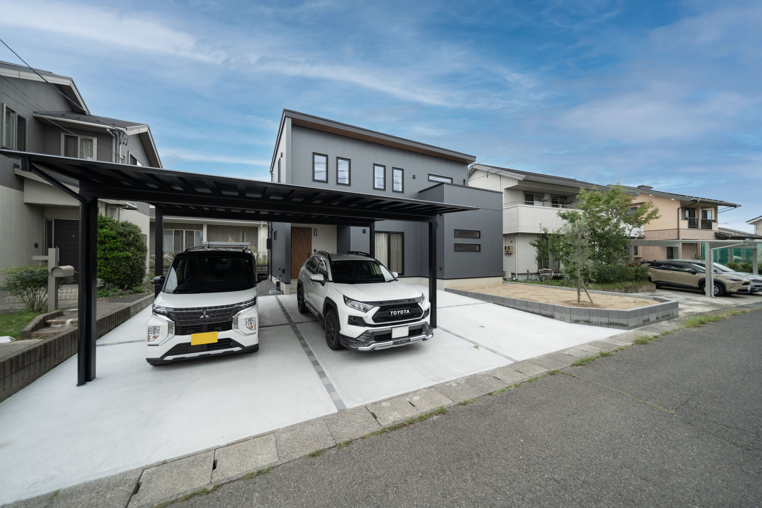 金属製サイディングのシャープな質感に、木目の軒天であたたかさを添えたスタイリッシュな外観。無機質と有機質が絶妙に調和したデザインで、道路からの印象も洗練された一棟に仕上がっています。キューブ型のフォルムが個性を放ちつつも、街並みに自然と溶け込むスマートな佇まいが魅力です。