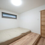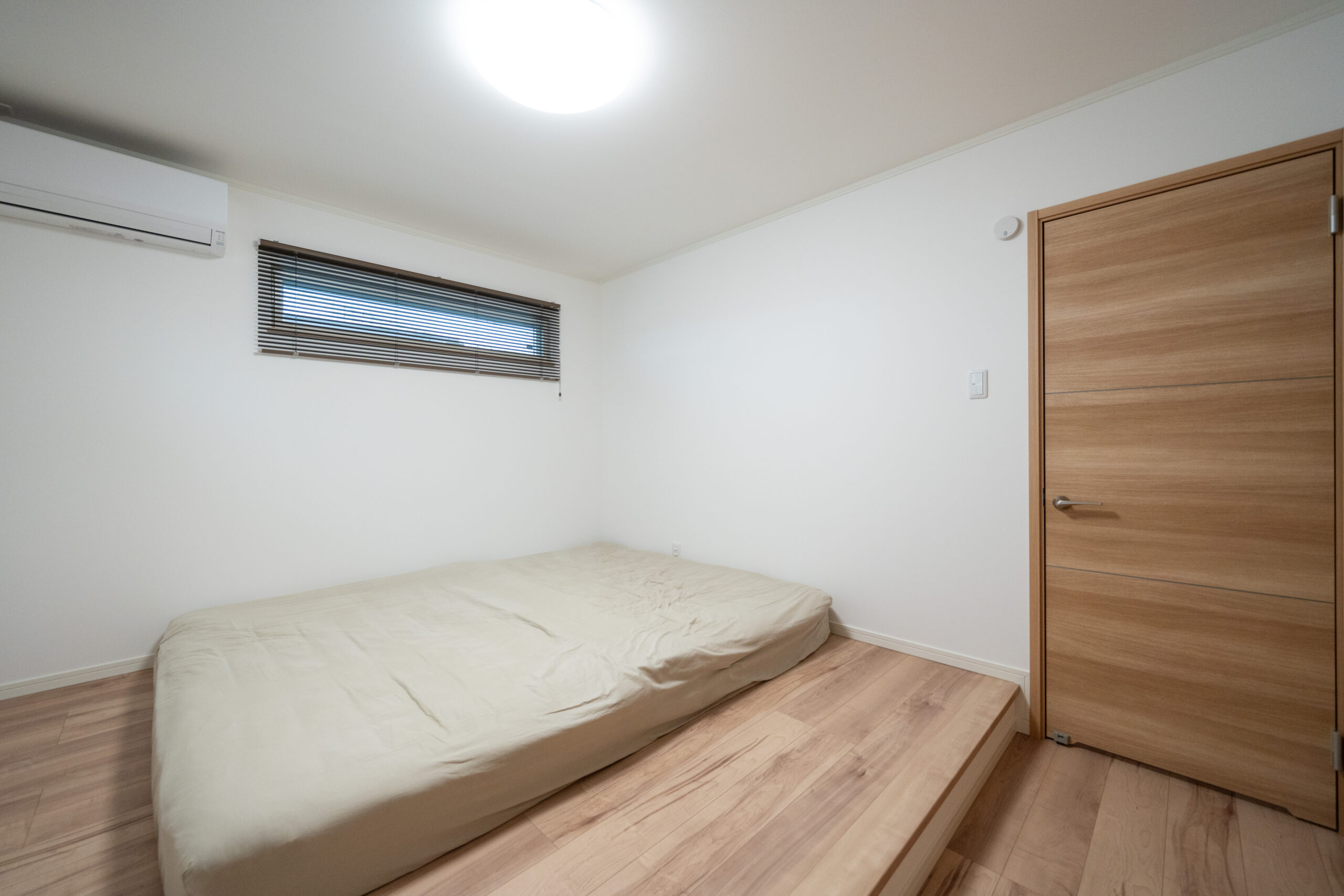 一段上がった床にマットレスを置いた、シンプルながら落ち着きある主寝室。ベッド下には段差があり、マットレスを立てかけて掃除がしやすい設計に。低い位置の窓からやわらかな光が入り、落ち着いた寝室時間をサポートしてくれます。