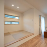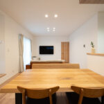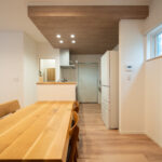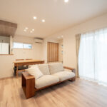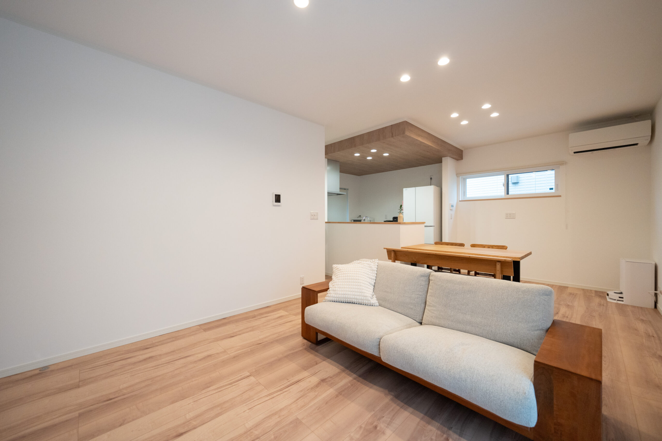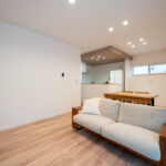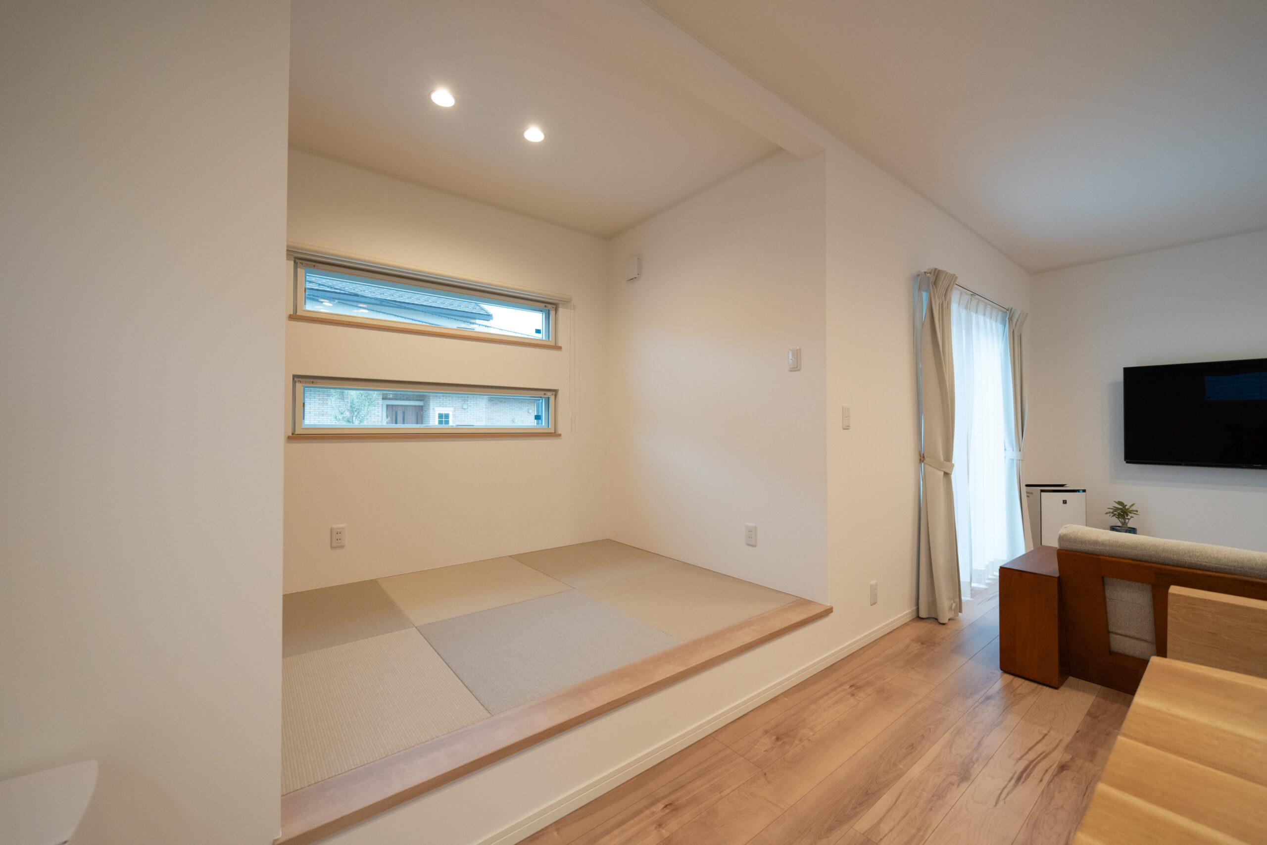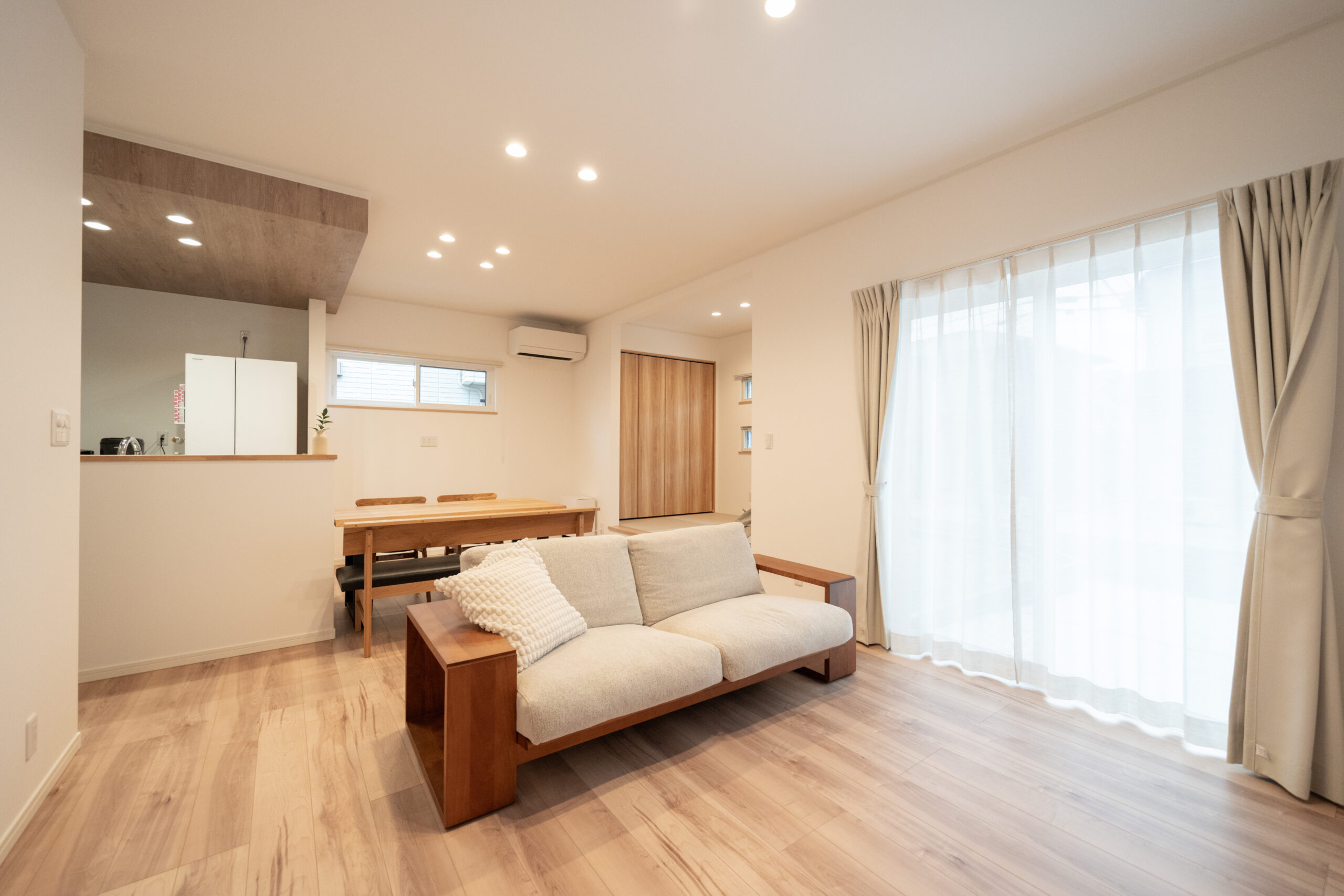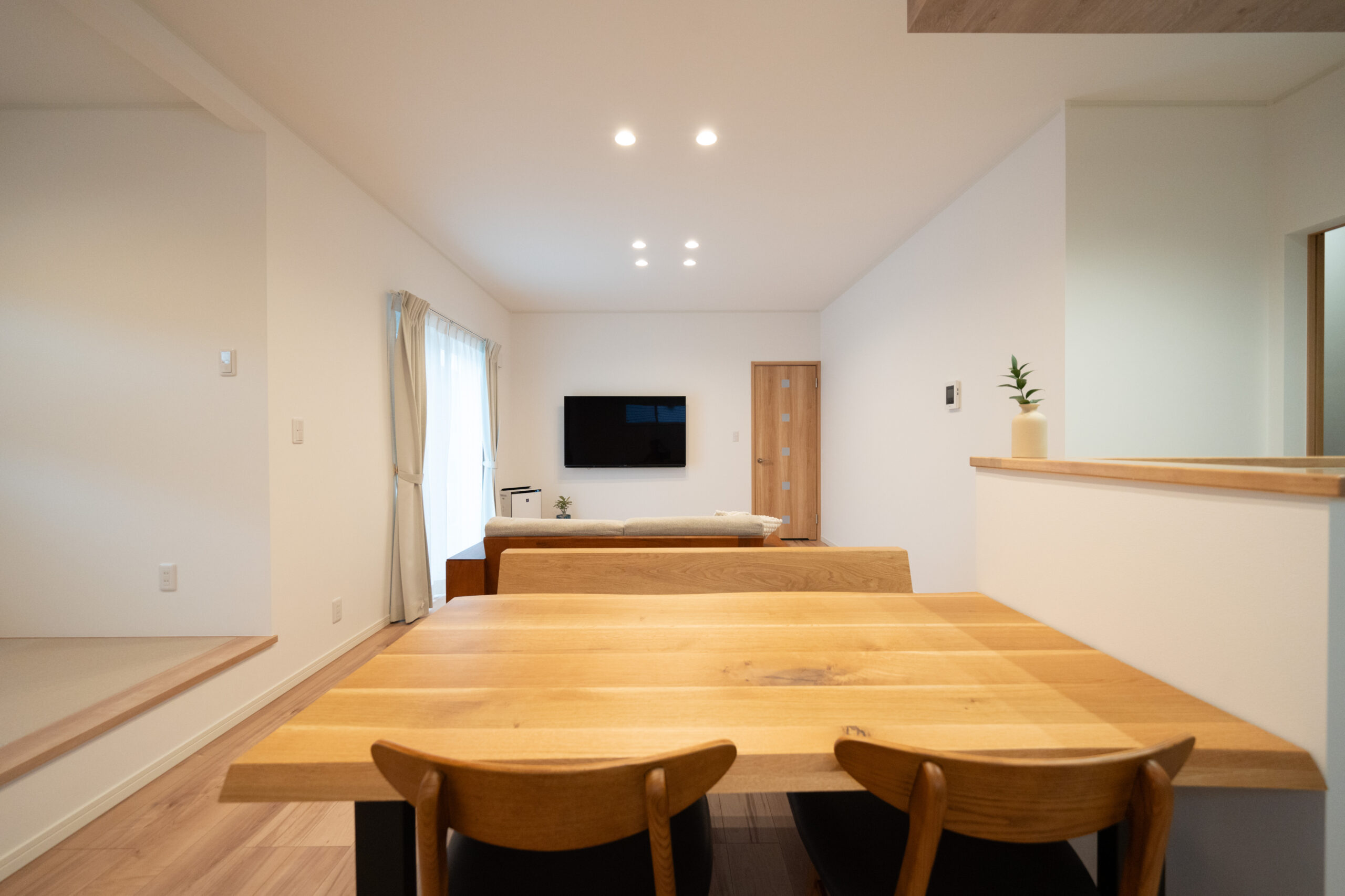 フローリングや家具の木目を基調にした、ぬくもりあふれるナチュラルなLDK。窓からやわらかな光が差し込み、家族がのびのびと過ごせる開放的な空間になっています。リビングの一角には小上がりの畳スペースを設けており、くつろぎやすさと使い勝手の良さを両立しています。