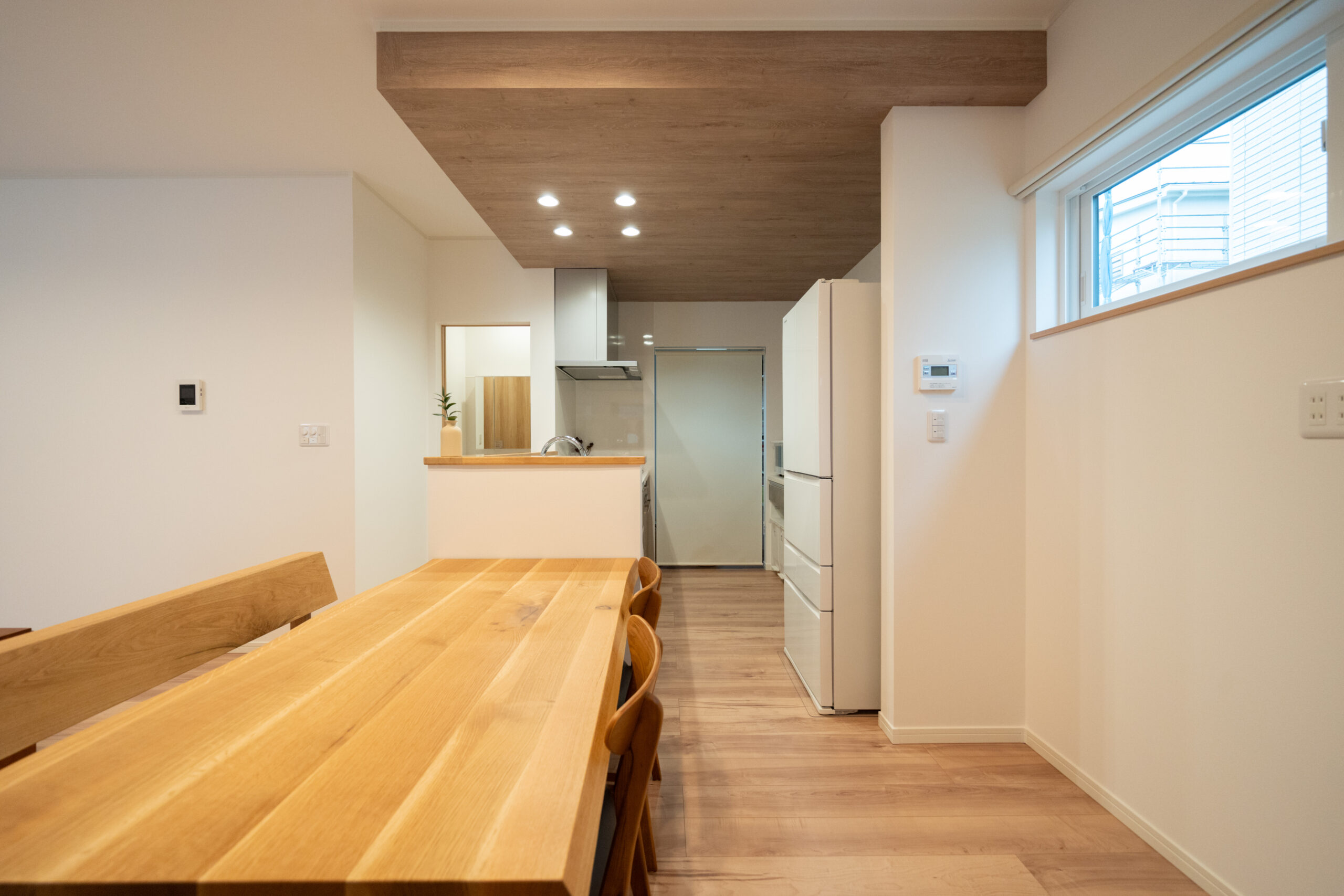 キッチンとダイニングを横並びに配置したことで、配膳や片付けがスムーズに。料理中も家族とのコミュニケーションがとりやすく、毎日の家事を快適にしてくれます。キッチン奥には大容量のパントリーを確保し、日用品や食品のストックもしっかり収納できます。