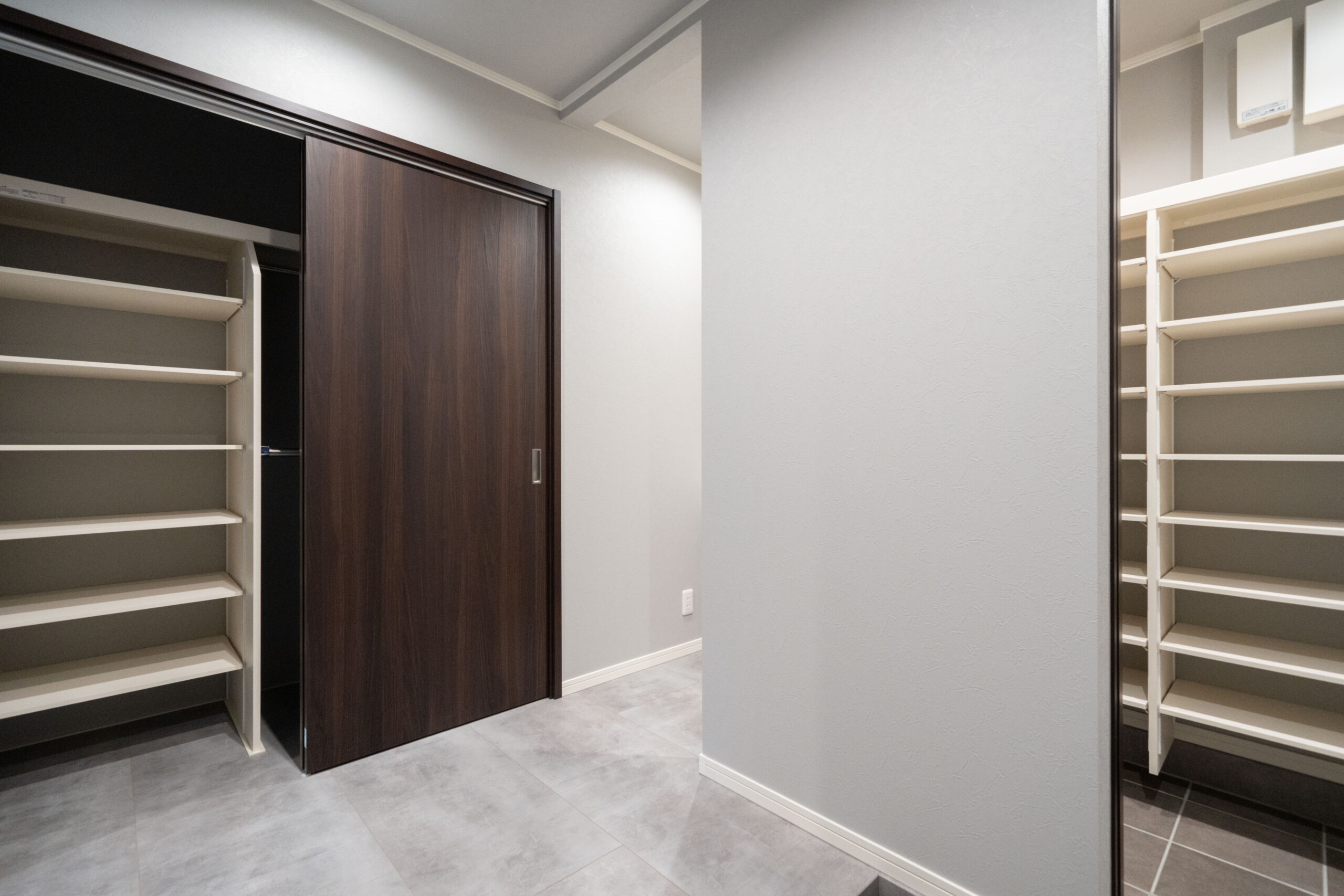 玄関には、大容量のシューズクロークを備えたウォークスルー動線を採用。家族用と来客用の動線を分けられるので、常にスッキリとした空間を保つことができます。靴はもちろん、ベビーカーやアウトドア用品などの収納にも便利です。