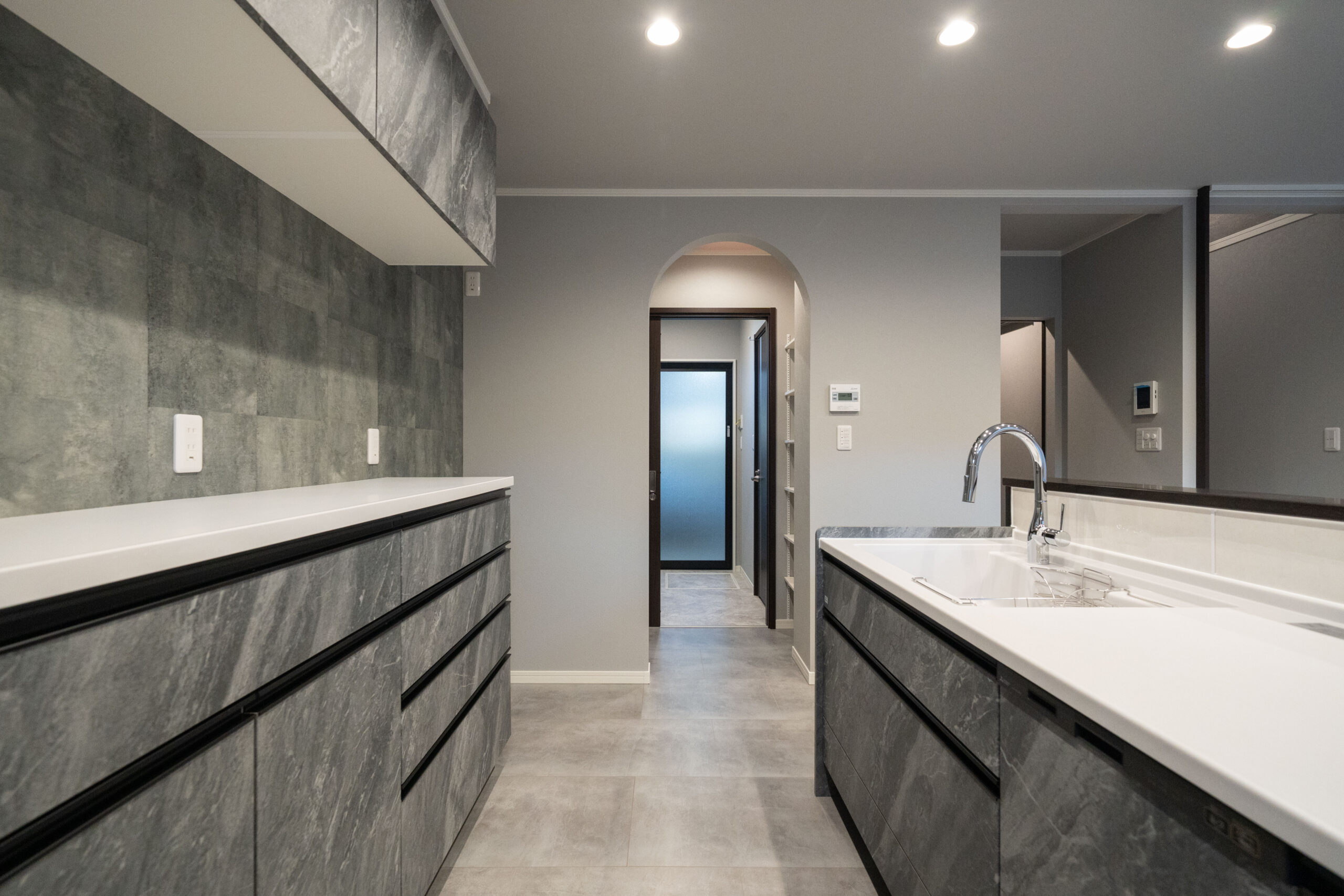 グレーの面材で統一されたキッチンは、空間に溶け込むようなスマートなデザイン。リビングと対面のレイアウトで、料理をしながら家族との会話も楽しめます。キッチン横には便利なパントリーも配置されており、収納力も抜群。さらに、リビング〜キッチン〜脱衣室〜ホールへとつながる回遊動線で、家事のしやすさにもこだわった間取りになっています。