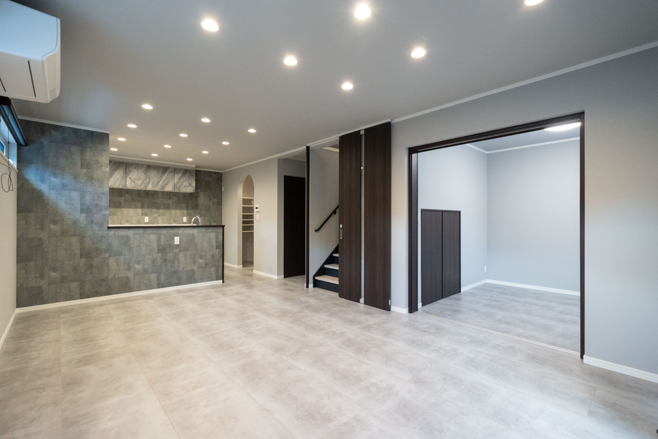 シンプルモダンな雰囲気でまとめられたLDKは、床や壁に採用されたモルタル調の素材が上質な空間を演出。全体をグレーで統一することで、洗練された印象に仕上がっています。隣には間仕切り可能な洋室があり、ライフスタイルに合わせて空間の使い方を変えられるのもポイントです。