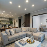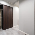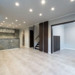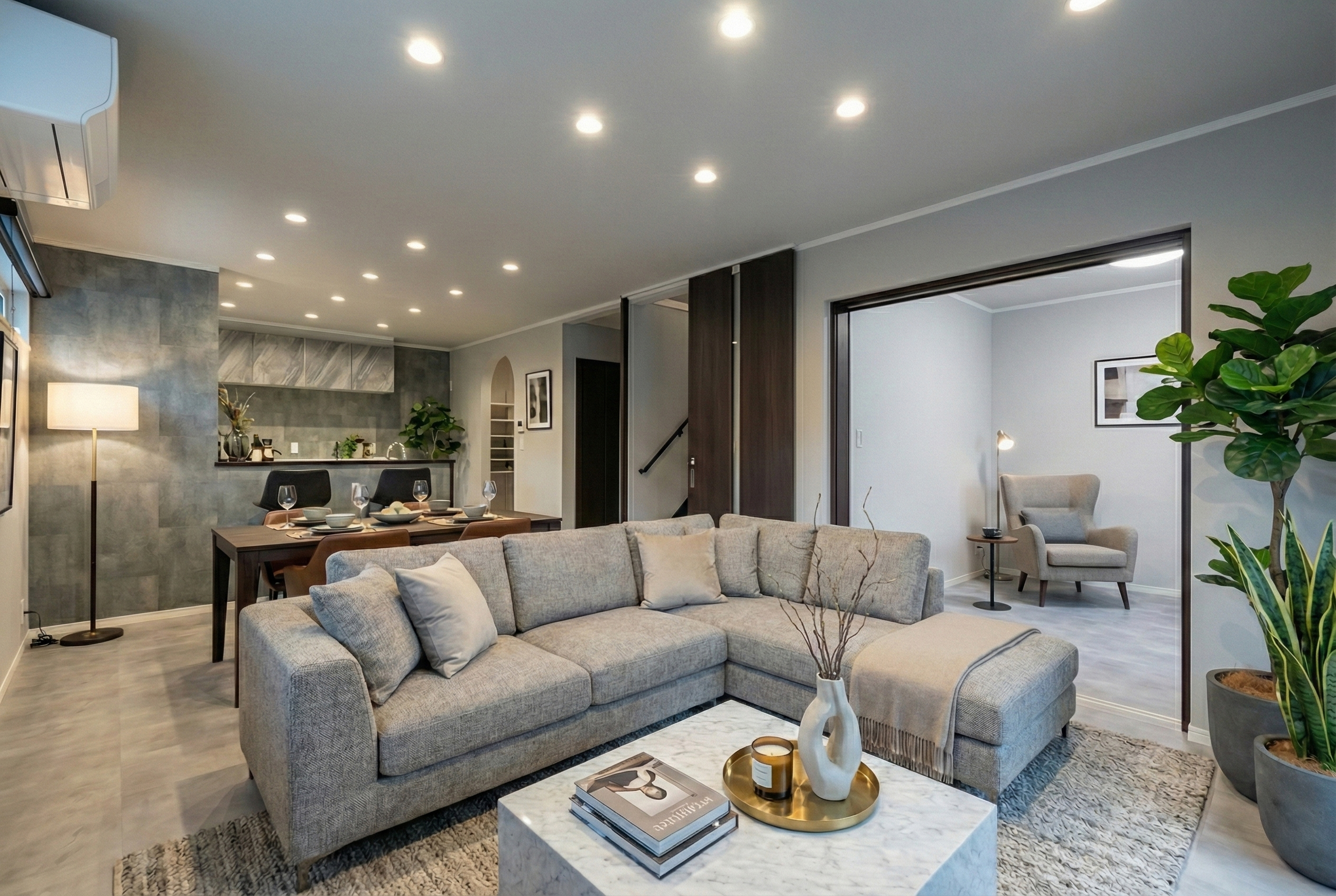 シンプルモダンな雰囲気でまとめられたLDKは、床や壁に採用されたモルタル調の素材が上質な空間を演出。全体をグレーで統一することで、洗練された印象に仕上がっています。隣には間仕切り可能な洋室があり、ライフスタイルに合わせて空間の使い方を変えられるのもポイントです。