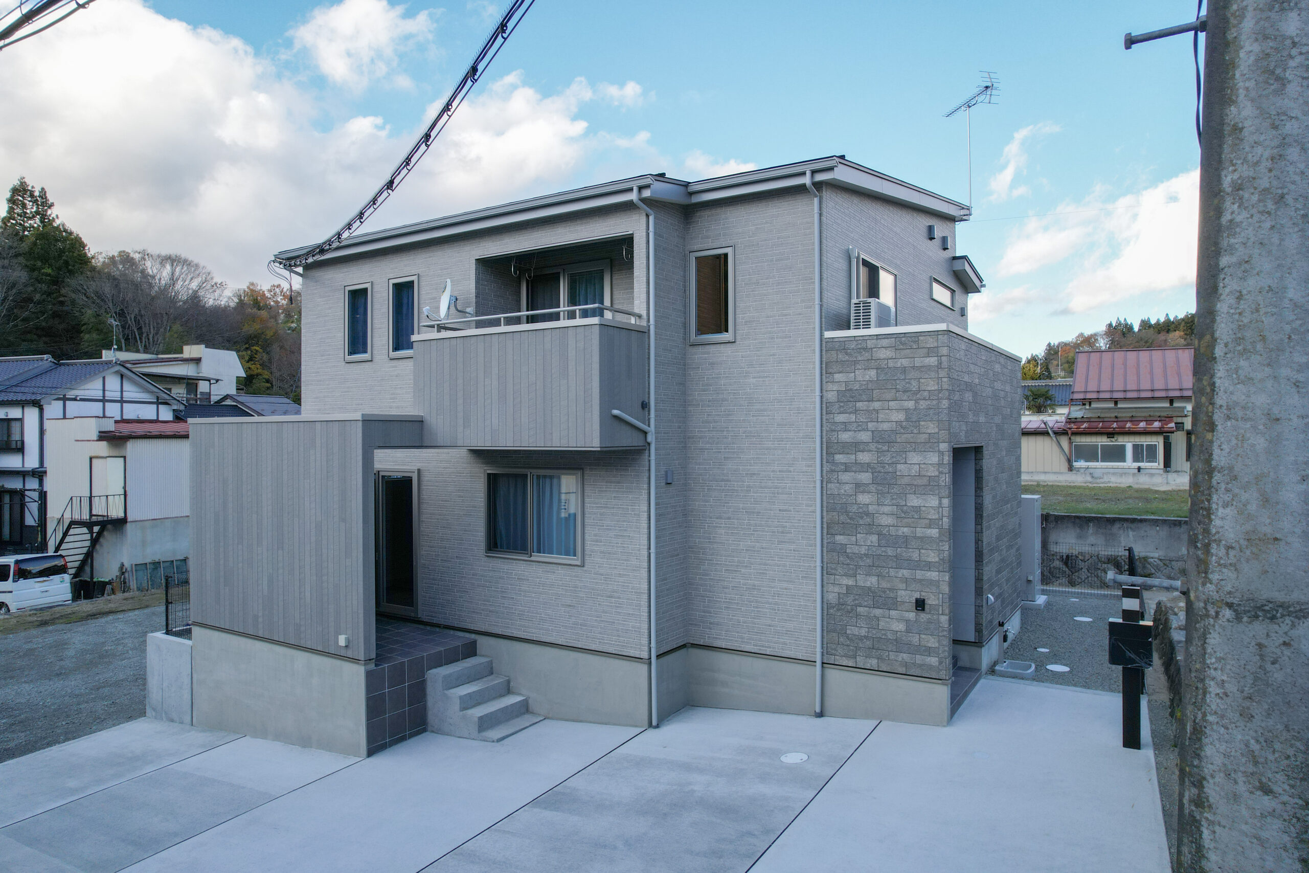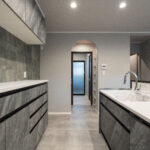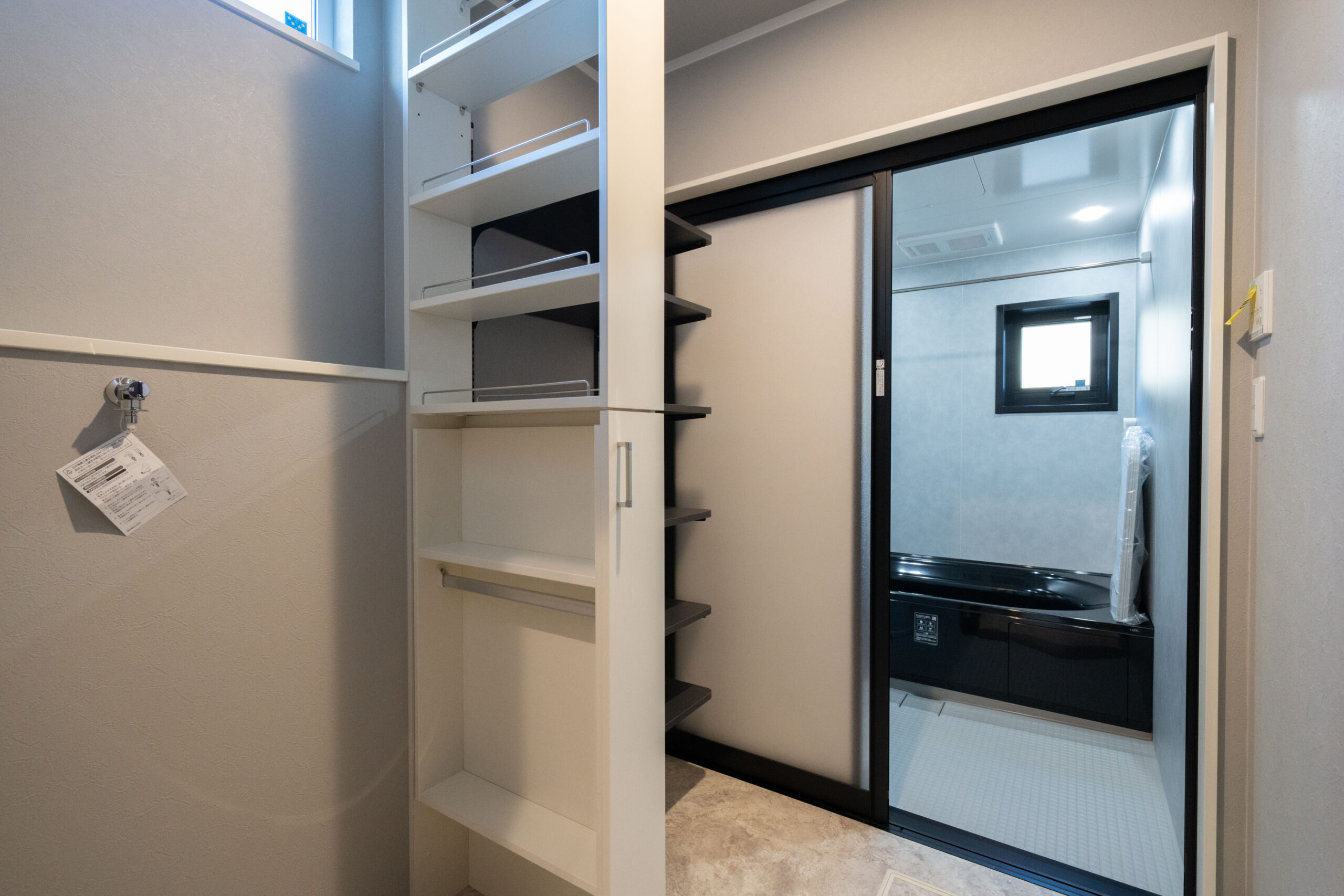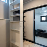 グレーの面材で統一されたキッチンは、空間に溶け込むようなスマートなデザイン。リビングと対面のレイアウトで、料理をしながら家族との会話も楽しめます。キッチン横には便利なパントリーも配置されており、収納力も抜群。さらに、リビング〜キッチン〜脱衣室〜ホールへとつながる回遊動線で、家事のしやすさにもこだわった間取りになっています。