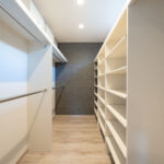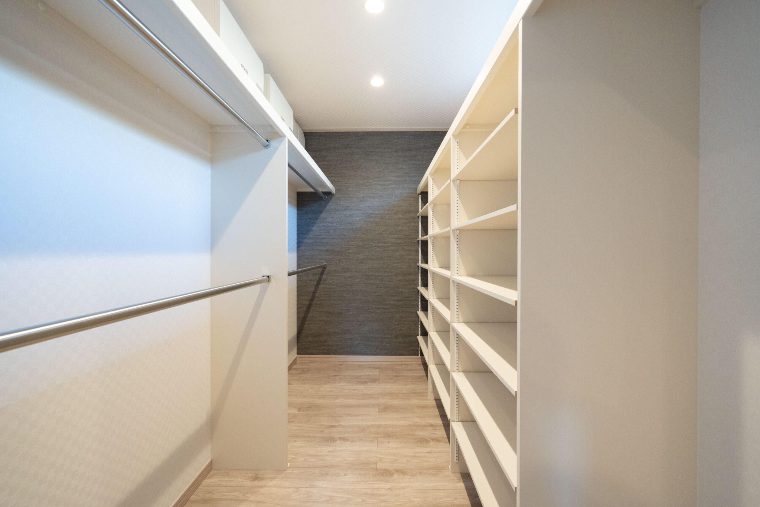 玄関には、大容量のシューズクロークを備えたウォークスルー動線を採用。家族用と来客用の動線を分けられるので、常にスッキリとした空間を保つことができます。靴はもちろん、ベビーカーやアウトドア用品などの収納にも便利です。