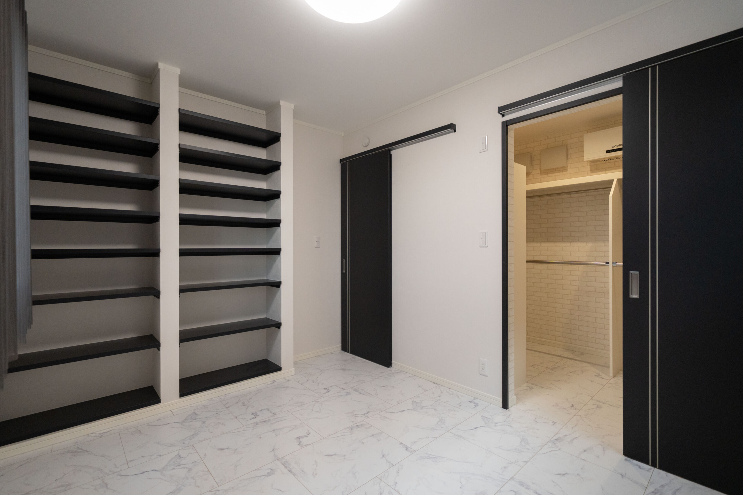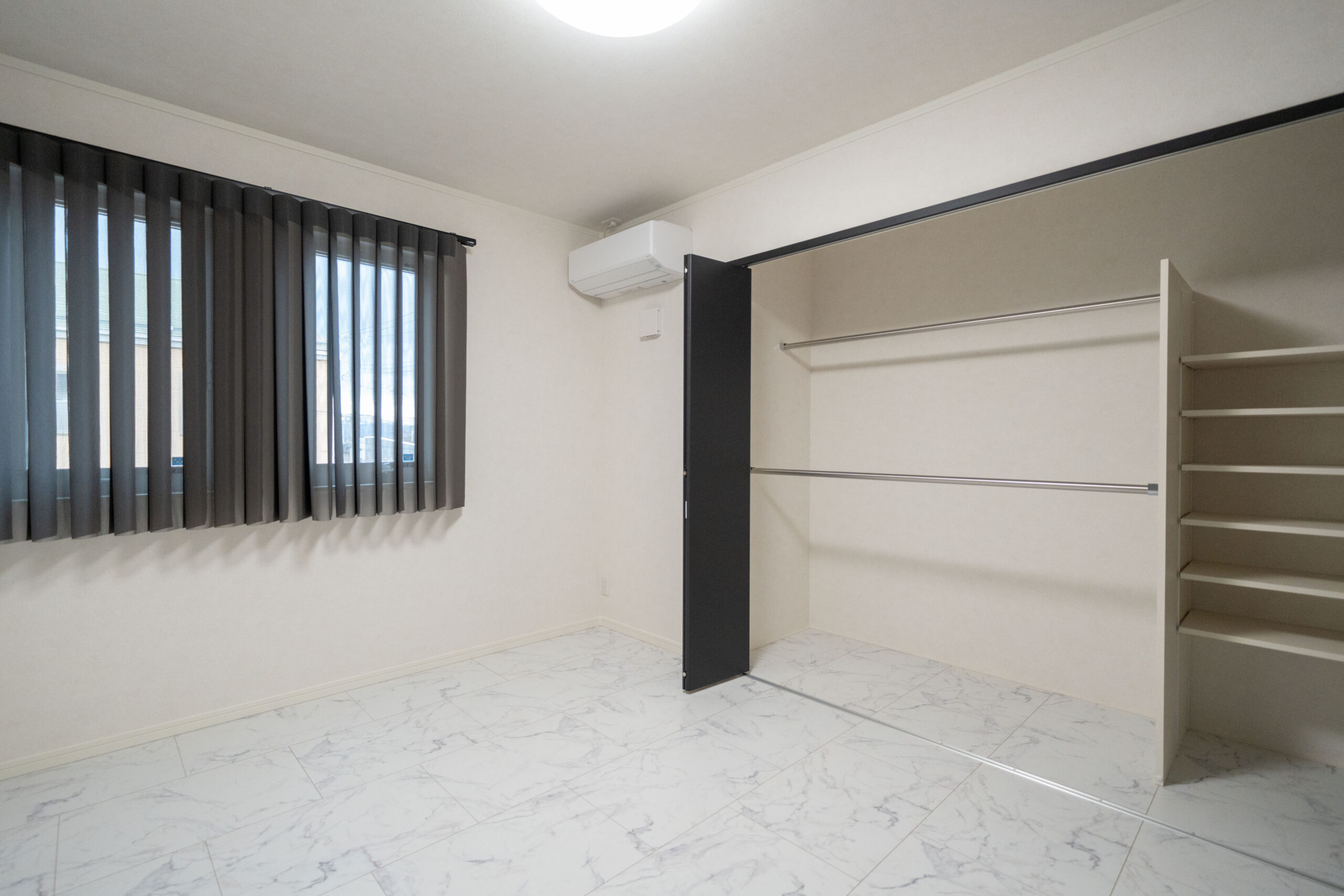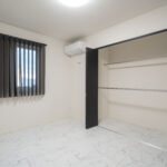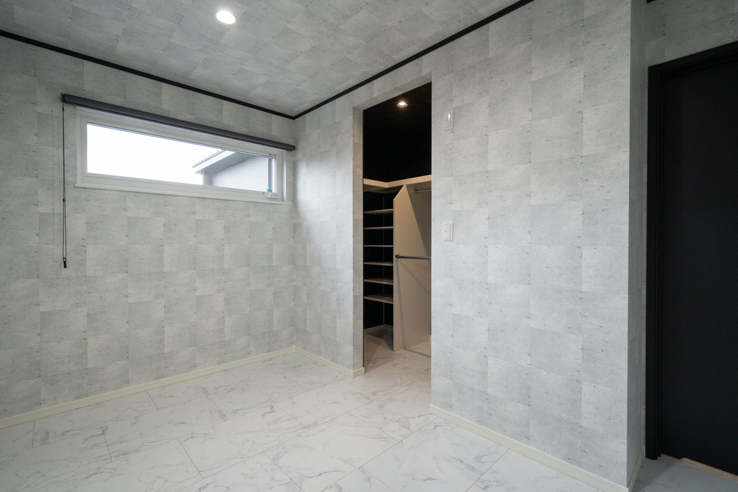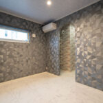 1階に主寝室を配置することで、平屋のような暮らしやすさを実現。階段の上り下りをせずに生活の中心が完結するため、将来的にも安心して住み続けられる間取りです。シックなアクセントクロスでまとめられた空間は、落ち着いた雰囲気で心地よい眠りを誘います。