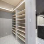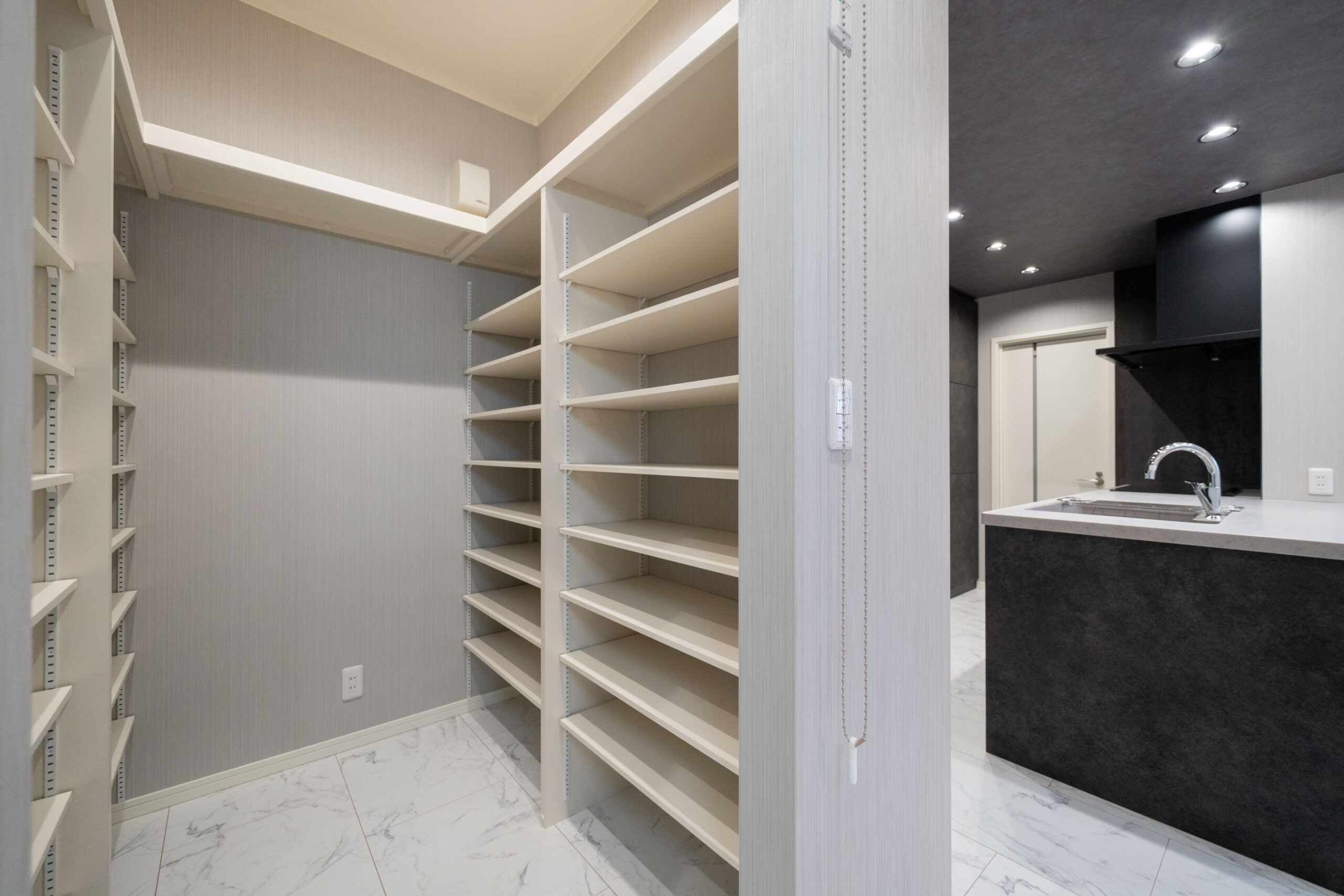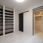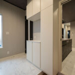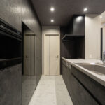 スタイリッシュなダークトーンでまとめられたキッチンは、リビング側に開けたハーフペニンシュラタイプを採用。家族とのコミュニケーションがとりやすく、前面のカウンターは軽食や作業スペースとしても活躍します。背面には大容量のカップボードを設けており、収納力も抜群。さらに玄関側から直接アクセスできるため、買い物帰りの動線もスムーズです。