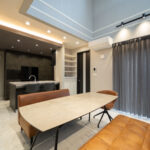 天井まで高さのある吹き抜けが、空間全体に心地よい開放感をもたらすLDK。間接照明やバーチカルブラインドを取り入れることで、柔らかな光と直線的な美しさが際立ち、まるでホテルのラウンジのような上質な雰囲気に仕上がっています。シンプルかつ洗練されたインテリアが、日常に特別感をプラスしてくれる空間です。