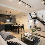モノトーンで仕上げたLDK。アイアンを使用したスケルトン階段の下は畳スペースに。一段下げることで圧迫感無くご使用頂けます。