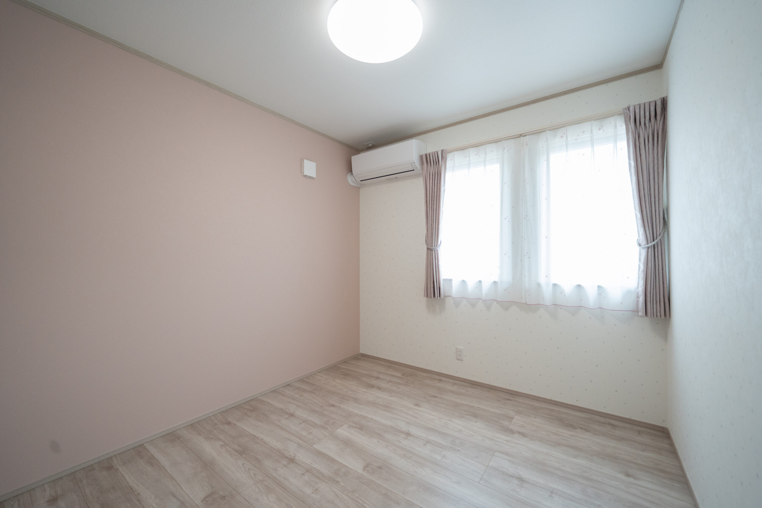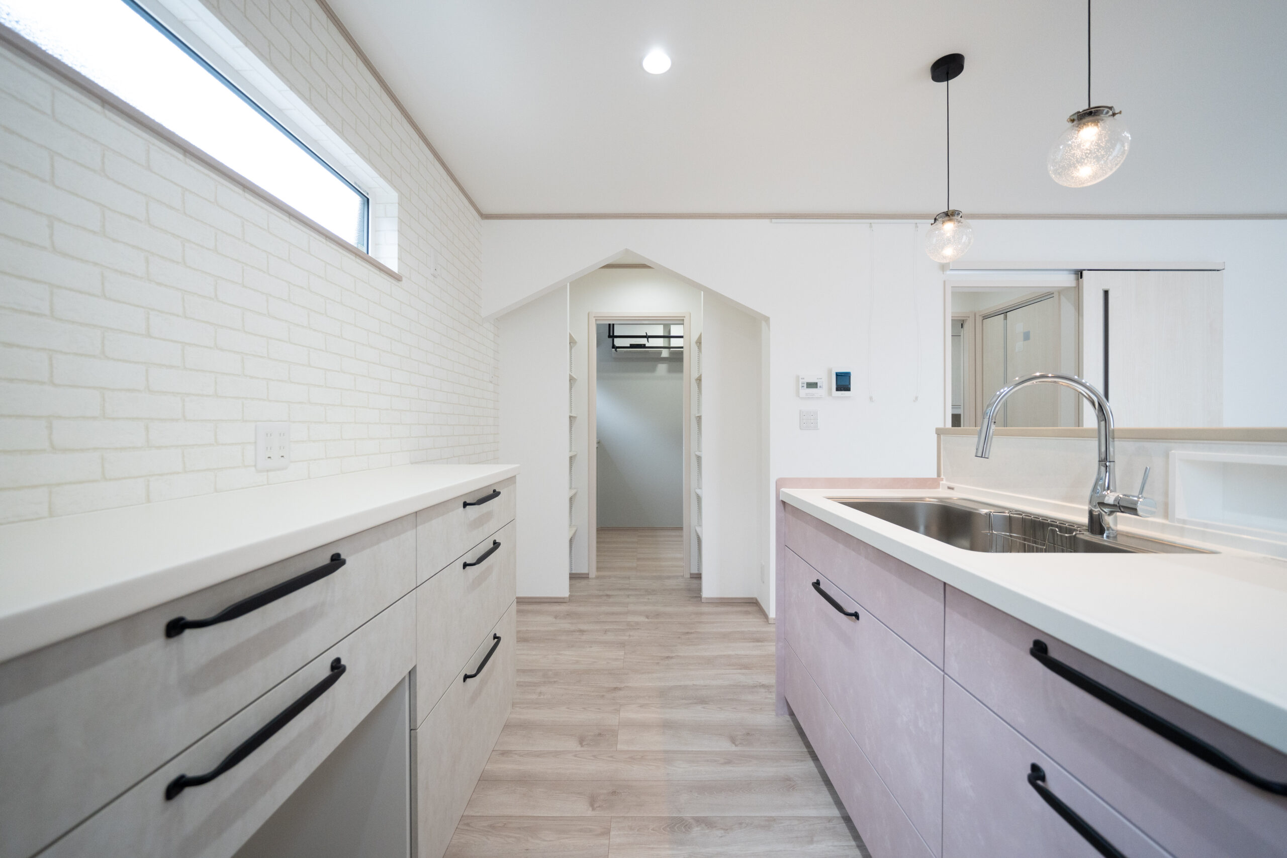 キッチンとカップボードは色味をあえて変えて、可愛らしさの中にもスタイリッシュな印象に。キッチン横には、家のカタチを模した三角の垂れ壁が目を引くパントリーを配置。アーチとはまた違う、遊び心のあるデザインで、日常のちょっとしたワクワクを演出しています。