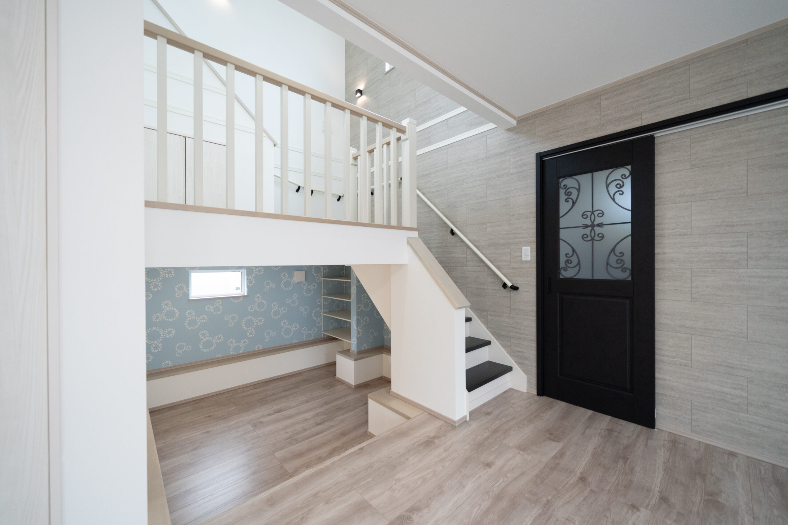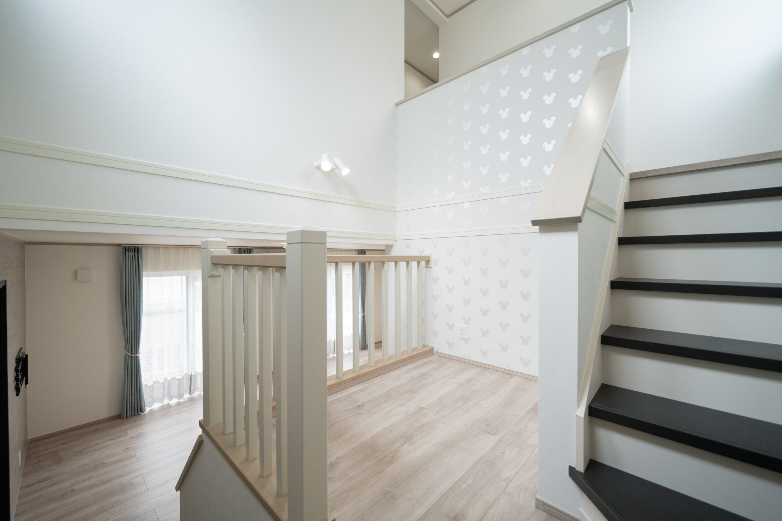 階段の途中に設けたスキップフロアは、リビングと程よい距離感を保ちつつ、視線が抜ける開放感も確保。スキップフロアの下には、半地下のヌックを配置し、ちょっとしたこもり感を楽しめるスペースに。どちらの空間にもミッキー柄のクロスを使っており、お子さまが楽しく過ごせる遊び心いっぱいのデザインになっています。