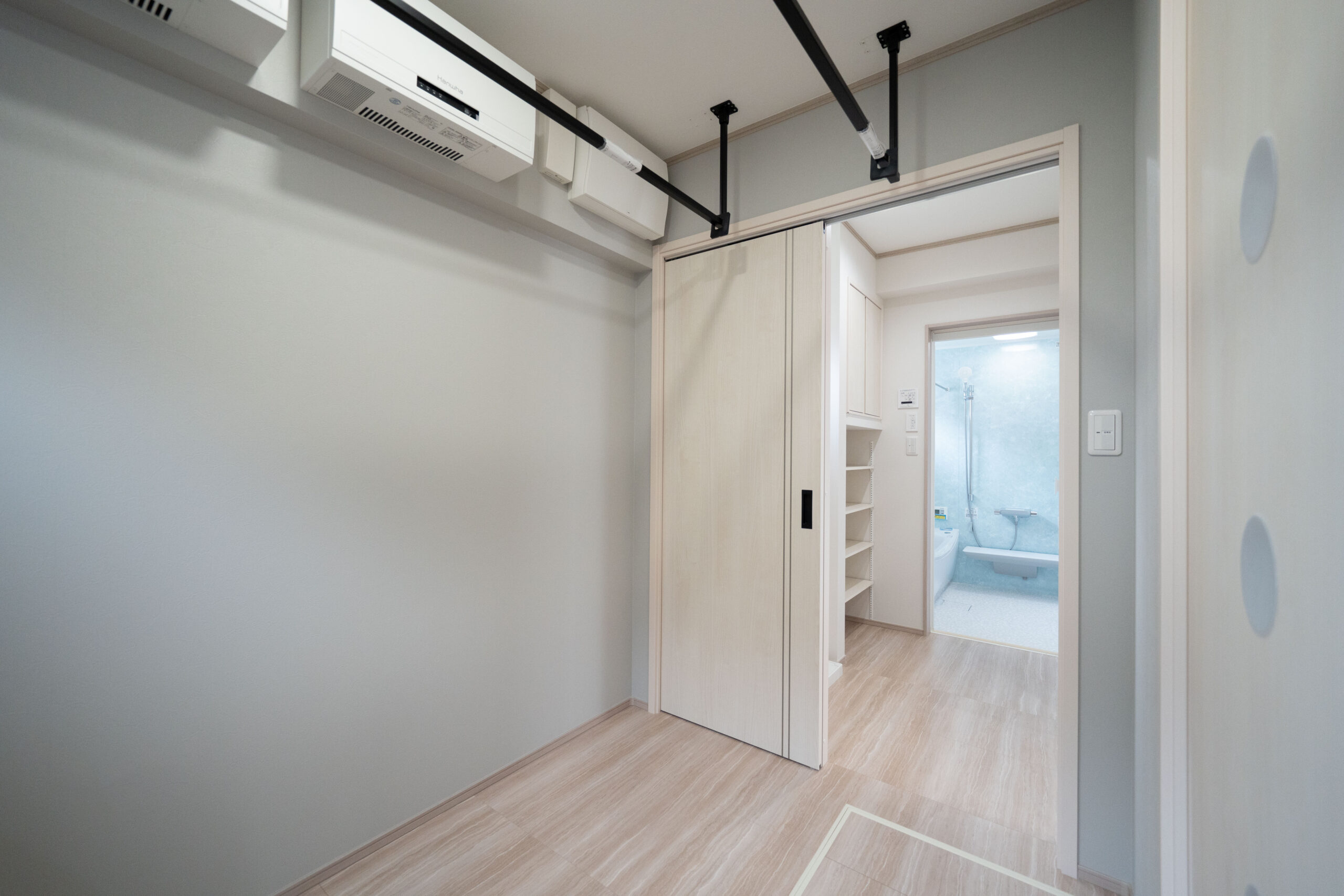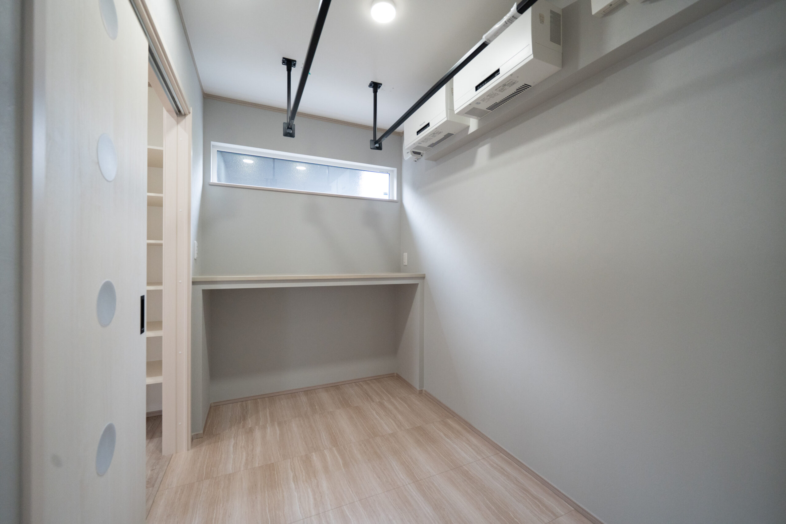 洗う・干す・たたむ・しまうが一箇所で完結するランドリールーム。天井にはハンギングバー、壁にはたたみ作業もできるカウンターを備え、家事の効率をぐっと高めてくれます。さらに、LDKから洗面スペースへとつながる回遊動線上に配置されているため、移動もスムーズでストレスフリーな家事動線が実現しています。