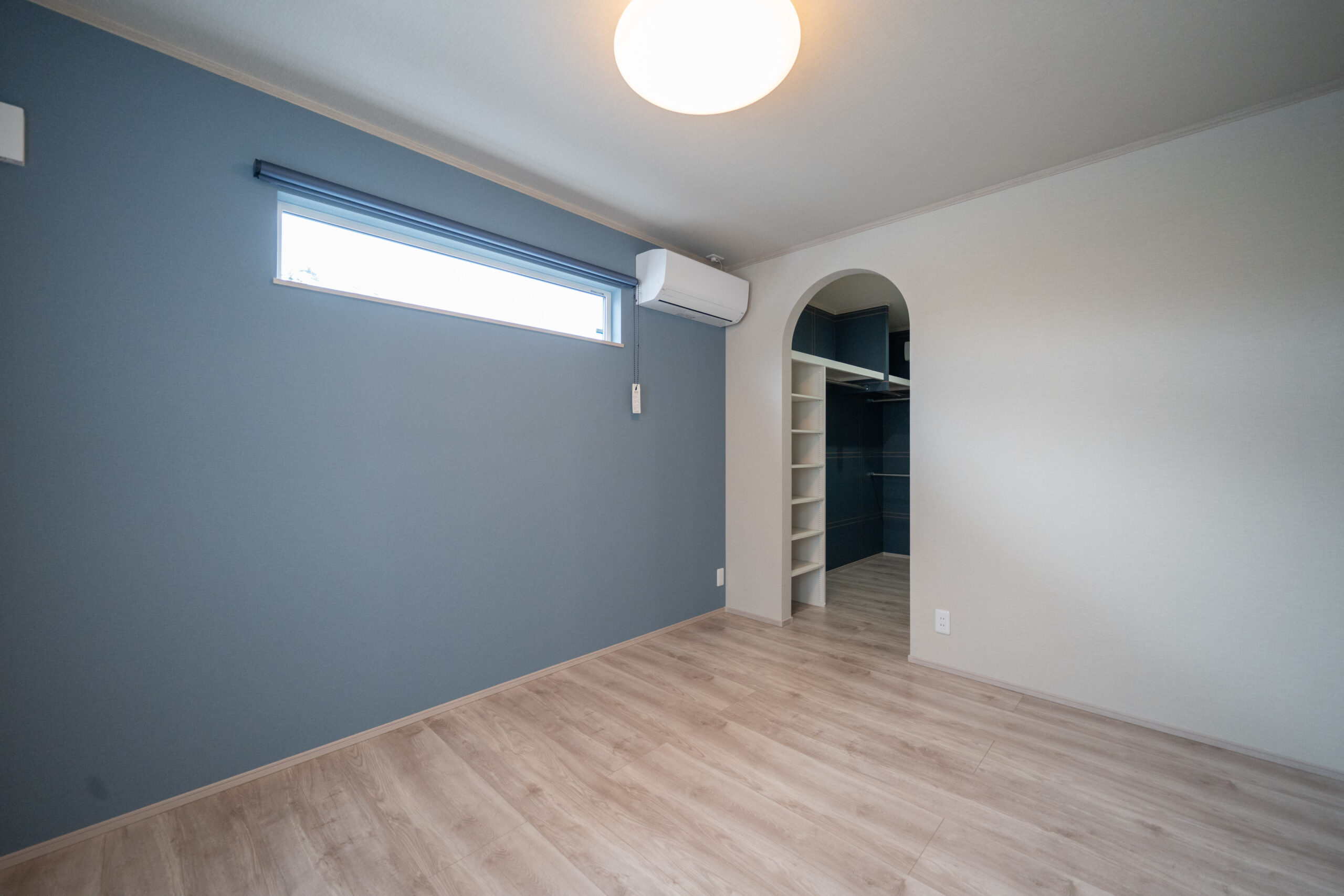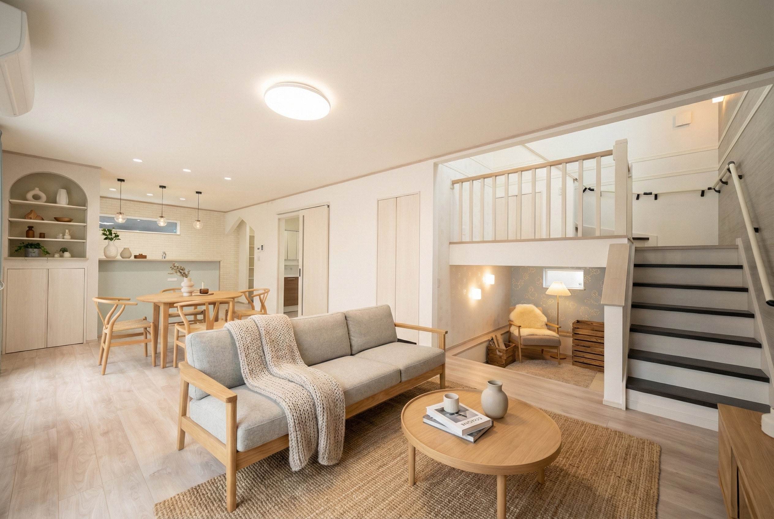白を基調とした空間に、水色のアクセントカラーや優しい木目が加わり、可愛らしさと清潔感が両立したLDK。キッチン・ダイニング・リビングがまっすぐに並ぶレイアウトで、どこにいても目が合いやすく、家族の会話が自然と生まれます。キッチン上部のペンダントライトや造作棚の曲線も、空間にやわらかい印象をプラスしています。