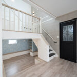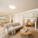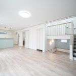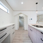 白を基調とした空間に、水色のアクセントカラーや優しい木目が加わり、可愛らしさと清潔感が両立したLDK。キッチン・ダイニング・リビングがまっすぐに並ぶレイアウトで、どこにいても目が合いやすく、家族の会話が自然と生まれます。キッチン上部のペンダントライトや造作棚の曲線も、空間にやわらかい印象をプラスしています。
