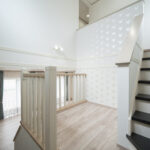 階段の途中に設けたスキップフロアは、リビングと程よい距離感を保ちつつ、視線が抜ける開放感も確保。スキップフロアの下には、半地下のヌックを配置し、ちょっとしたこもり感を楽しめるスペースに。どちらの空間にもミッキー柄のクロスを使っており、お子さまが楽しく過ごせる遊び心いっぱいのデザインになっています。
