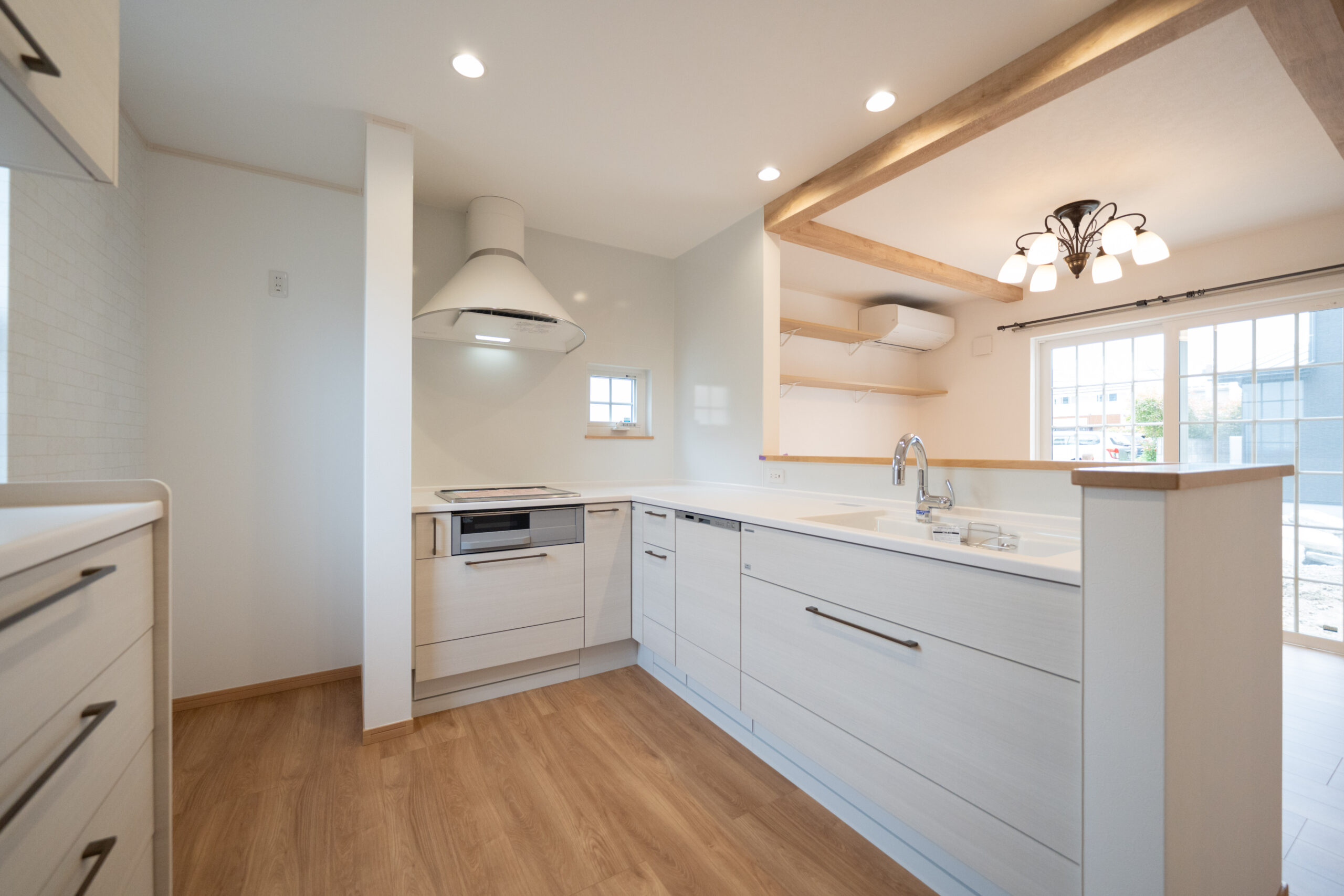 白を基調としたL字型のキッチンは、作業スペースが広く、動線もスムーズで家事がしやすいレイアウト。キッチン横にはたっぷり収納できる大容量のパントリーがあり、ストックや調理器具もすっきり収まります。デザイン性と機能性を兼ね備えた、毎日の料理が楽しくなる空間です。