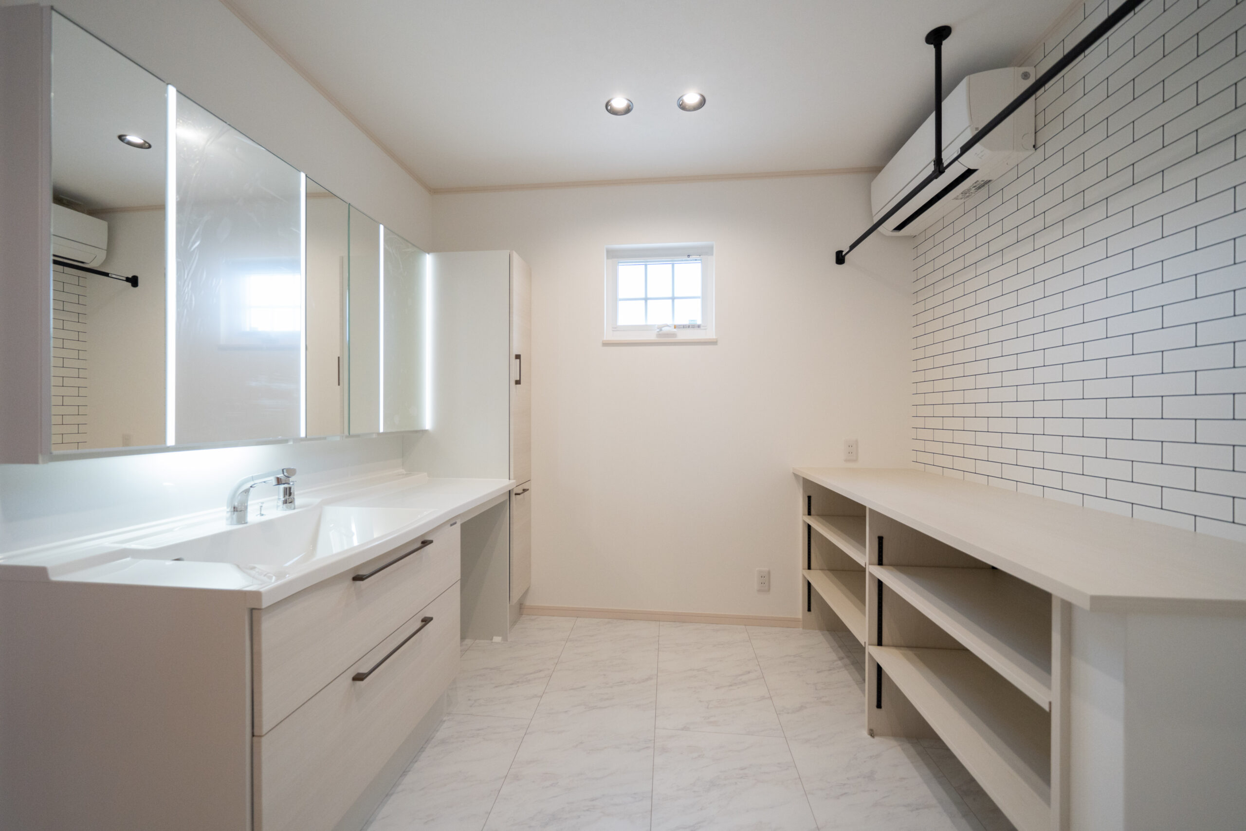 洗濯・乾燥・たたむ・収納が一箇所で完結する、理想のランドリールーム。広めのカウンターや収納棚、そしてゆったりとした幅広の洗面台も備えており、家族が並んで使える設計です。家事のしやすさを重視した空間で、毎日の暮らしにゆとりをもたらします。