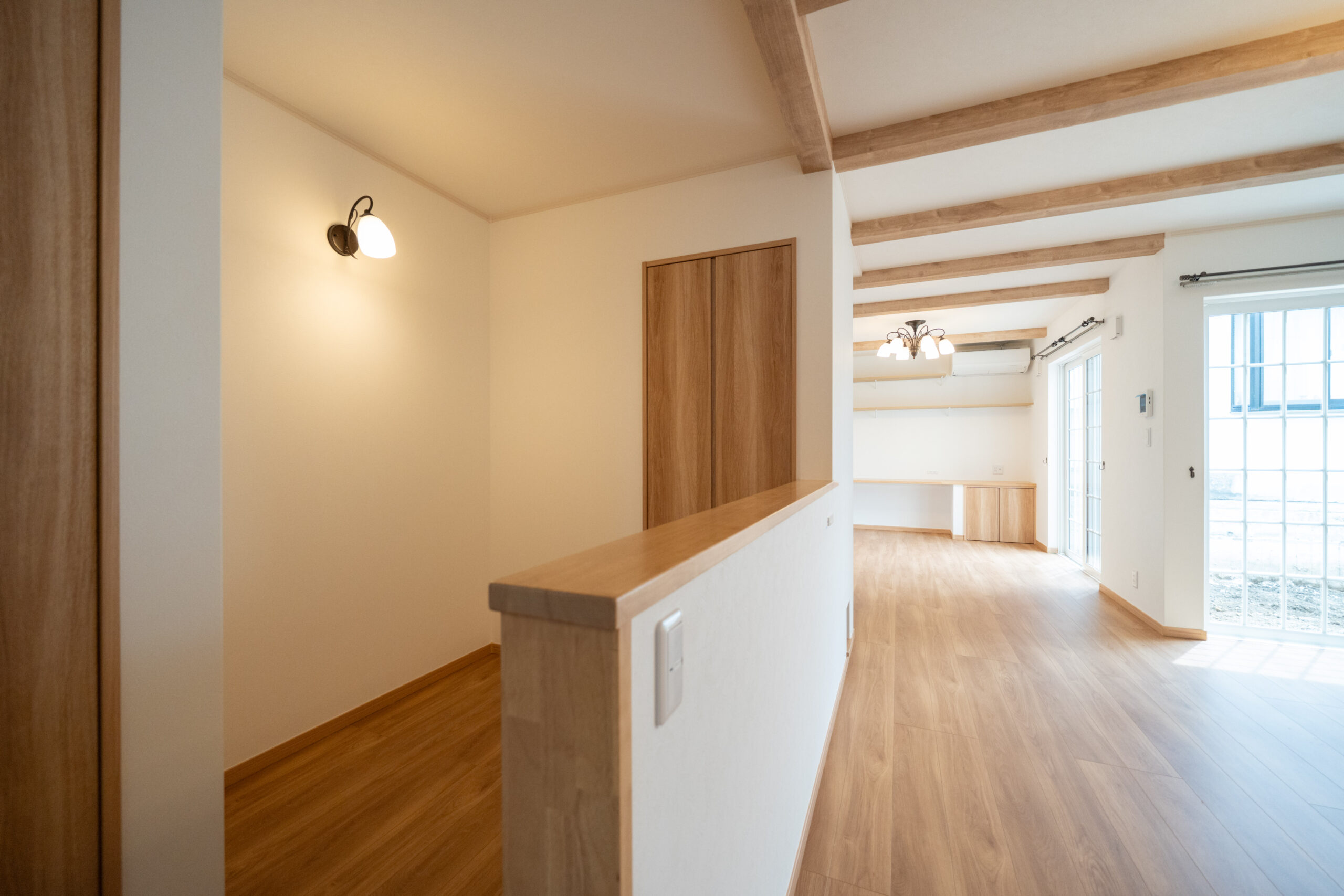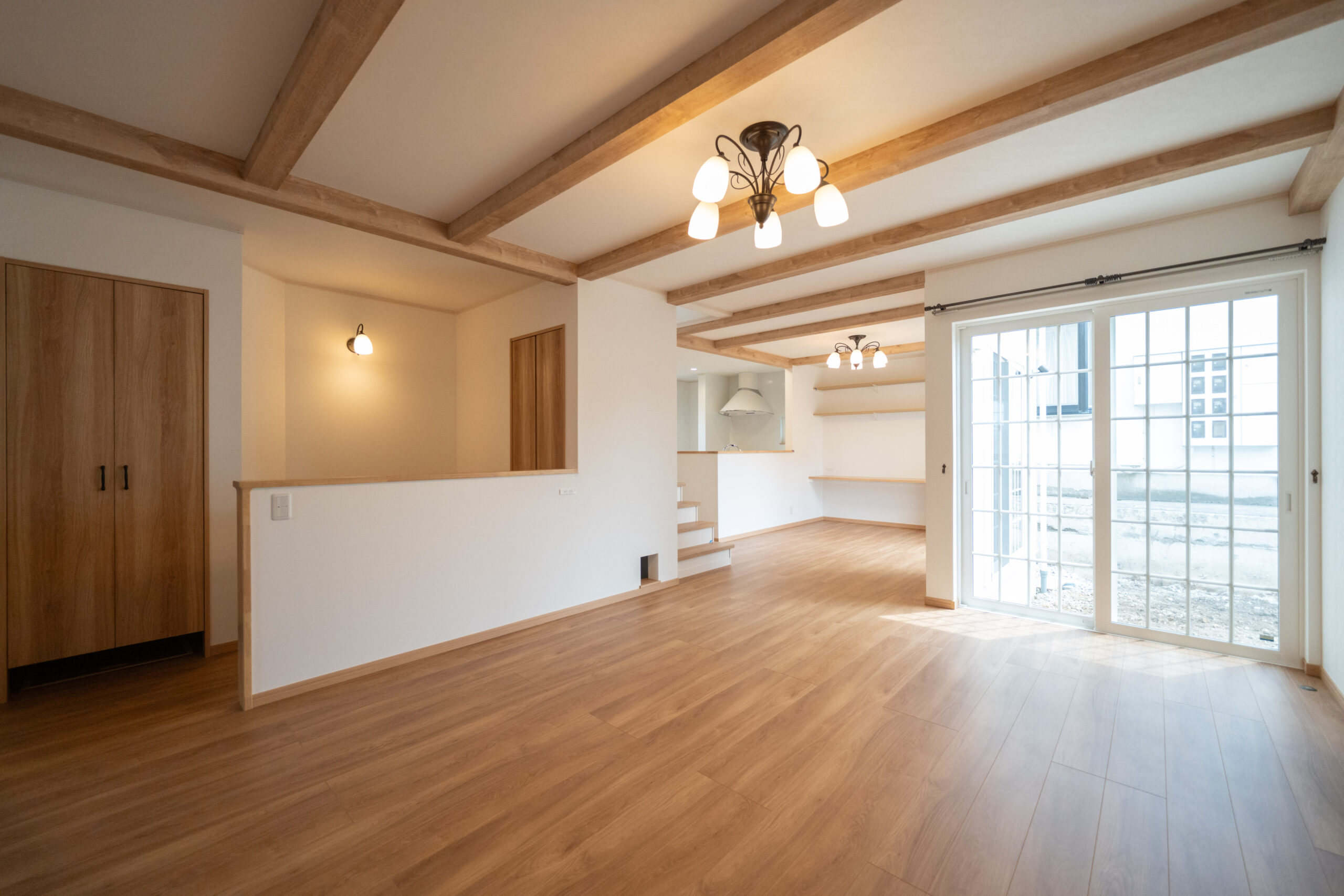 ナチュラルな木目のフローリングと化粧梁、そしてクラシカルなシャンデリアが調和したLDKは、まるで海外のお家のような可愛らしさ。明るく開放的な空間の中に、温かみのある落ち着いた雰囲気が漂います。リビング横には小さなペットスペースも備え、家族みんなが心地よく暮らせる工夫が詰まっています。