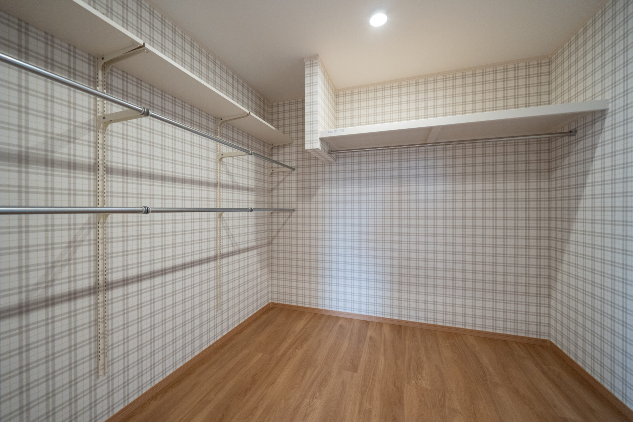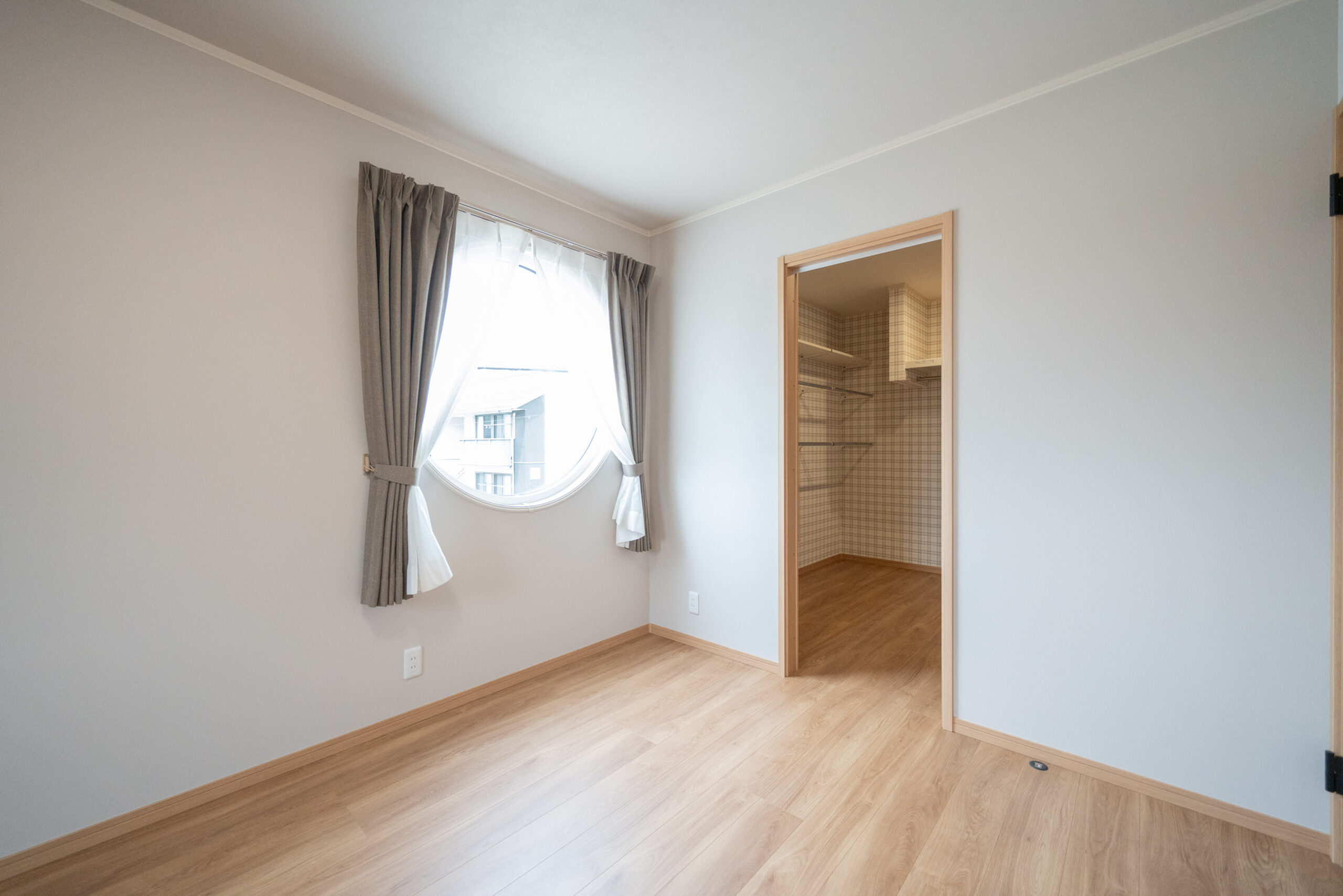 印象的な丸い窓がアクセントになった主寝室は、柔らかな光が差し込むやさしい空間。隣にはチェック柄のクロスがかわいいウォークインクローゼットを配置し、ホール側からもアクセス可能な回遊動線を採用しています。デザイン性と実用性を両立したプライベート空間です。