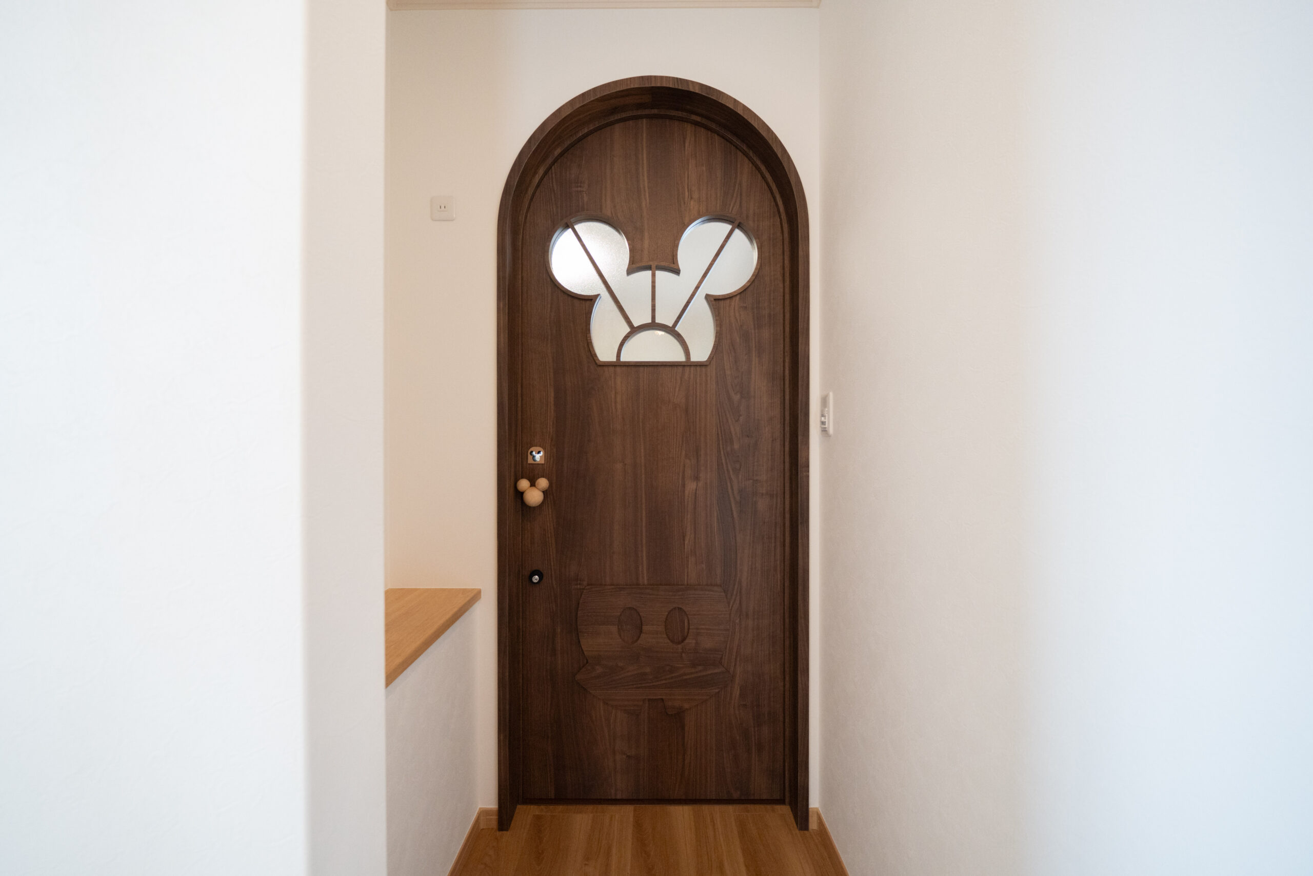 ディズニー好きにはたまらない、夢のようなホビールーム。造作のミッキーモチーフの扉を開けると、壁紙から照明、造作棚に至るまでディズニー一色のわくわく空間が広がります。ミッキー型の壁にはスクリーンとスピーカーを埋め込み、ホームシアターとしても楽しめる仕様に。好きな世界観にどっぷり浸れる、まさに夢の部屋です。