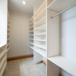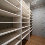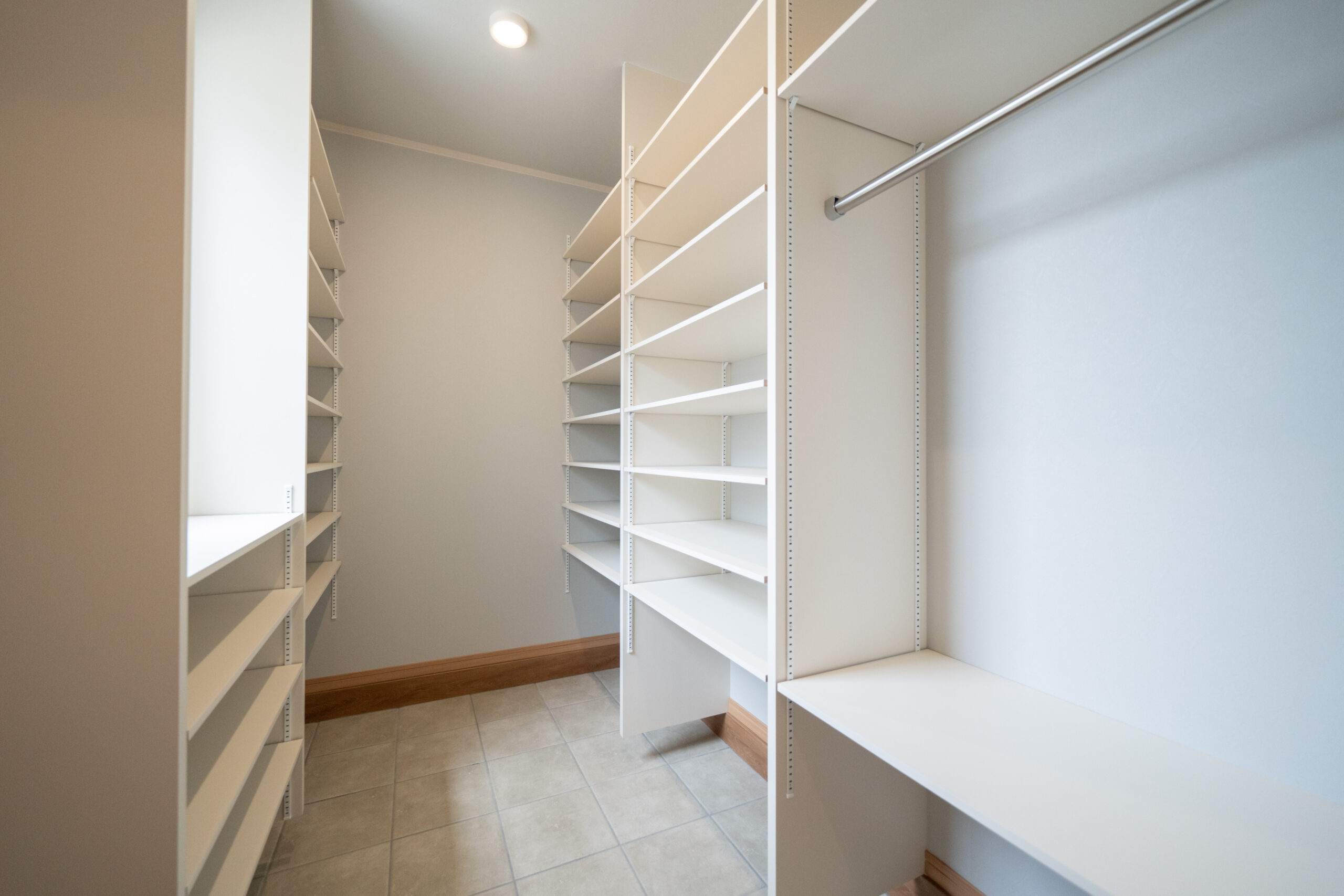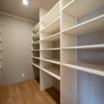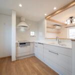 白を基調としたL字型のキッチンは、作業スペースが広く、動線もスムーズで家事がしやすいレイアウト。キッチン横にはたっぷり収納できる大容量のパントリーがあり、ストックや調理器具もすっきり収まります。デザイン性と機能性を兼ね備えた、毎日の料理が楽しくなる空間です。